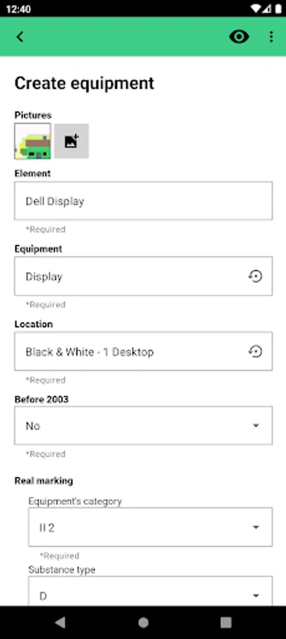 You can fill equipment properties for every field in the form and also a picture of the equipment.