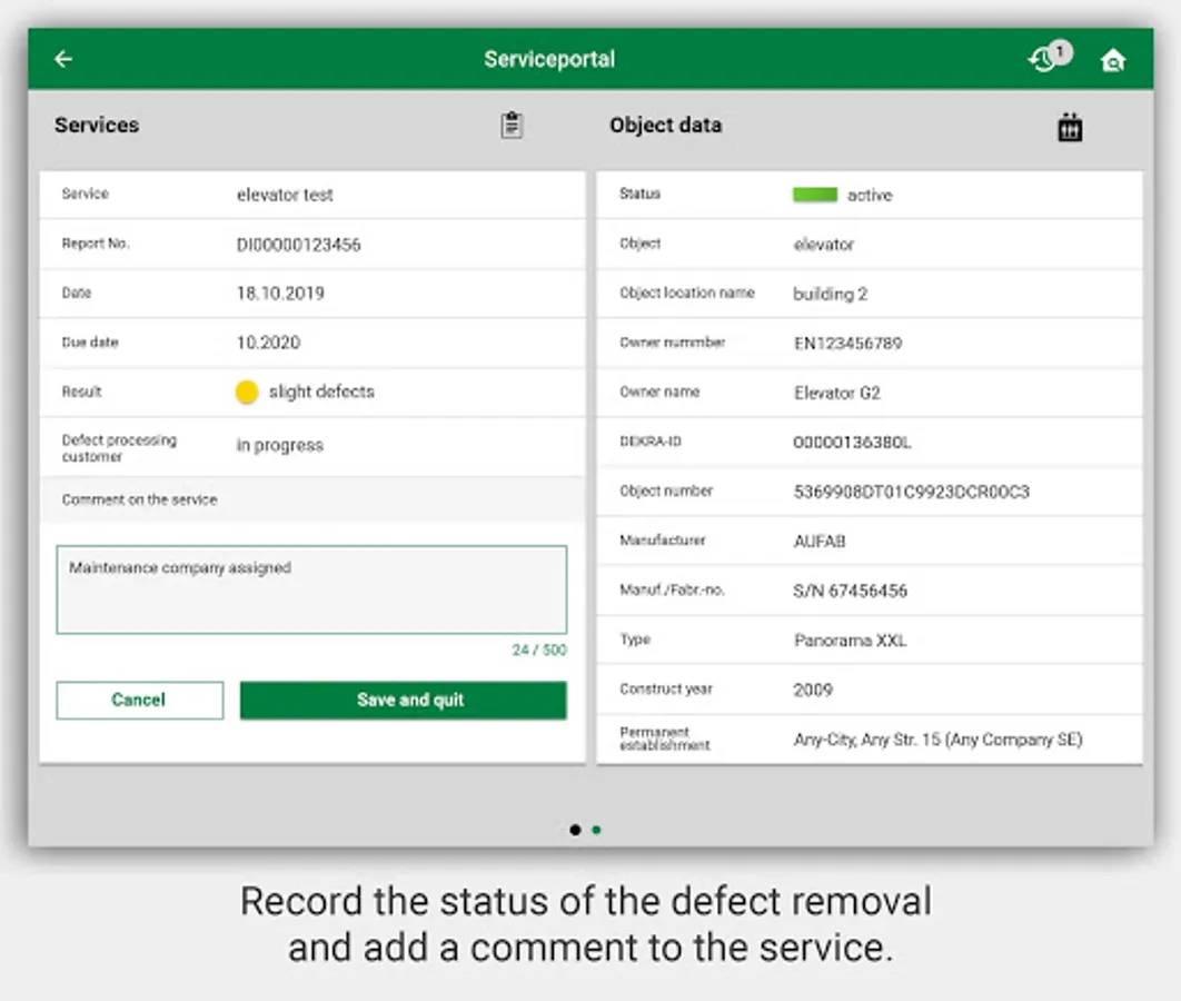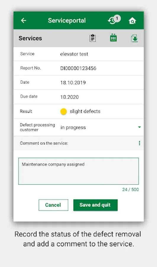 - Add comments to inspections and services, for example, to record the status of defect processing in detail for your internal purposes