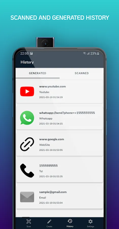 - QR Code Scanner - Scan, Read, Generate For Free allow you to encrypt personal information, create codes for email, phone numbers, text, a web link, social media accounts or links and share via other apps.