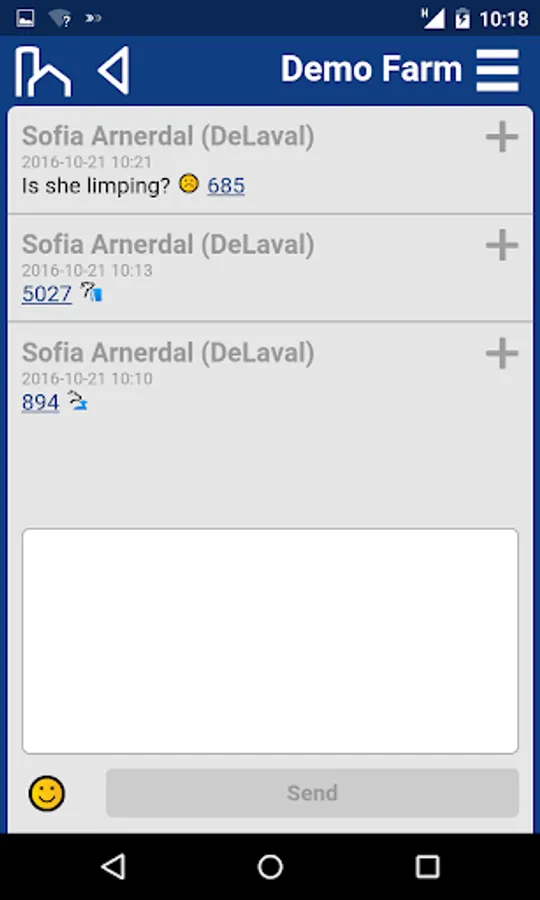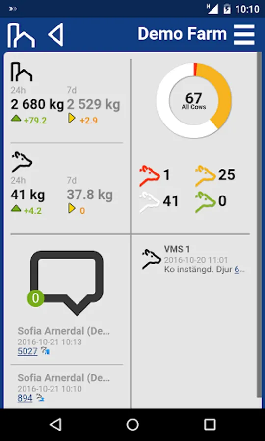 DeLaval MyFarm receive alerts and presents real-time milk production and animal data from your VMS (Voluntary Milking System) or AMR (Automatic Milking Rotary) to your device. Alerts appear even if the app is running in the background.