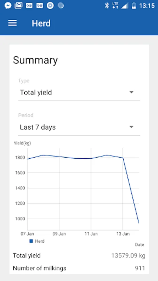 - Milk harvesting totals per milking session, day, week or lactation.