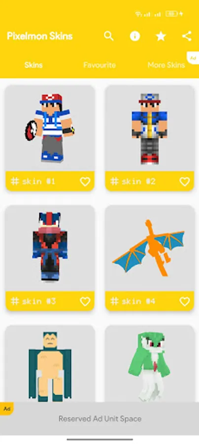 With the Pixelmon Skins for Minecraft PE app, you can transform your Minecraft character into various Pixelmon creatures, including Pika, Charizard, and many more. Immerse yourself in the colorful and vibrant Pixelmon universe as you explore Minecraft's vast landscapes with your favorite Pocket Monsters.