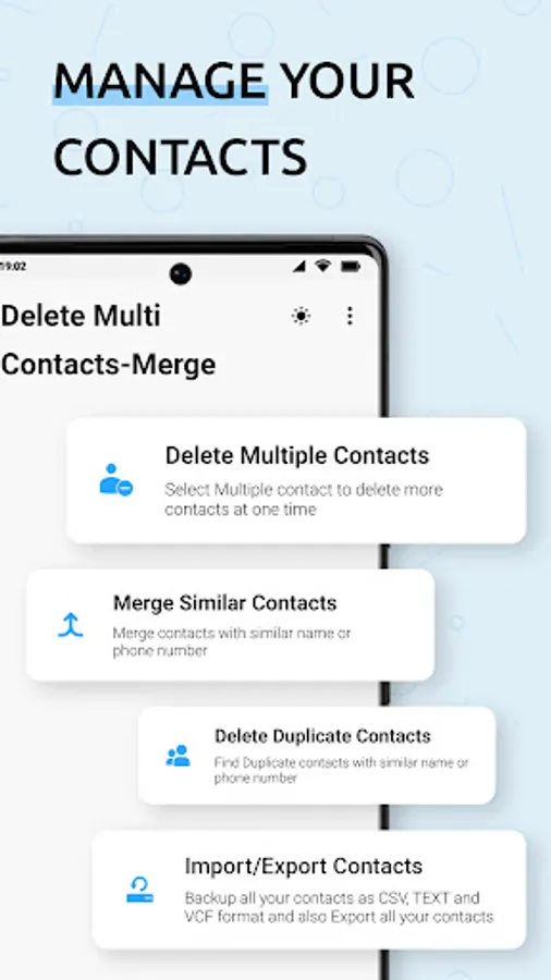 Delete Multi Contacts app gives multiple features like delete multiple contacts, merge similar contacts, delete duplicate contacts, and import/export contacts.