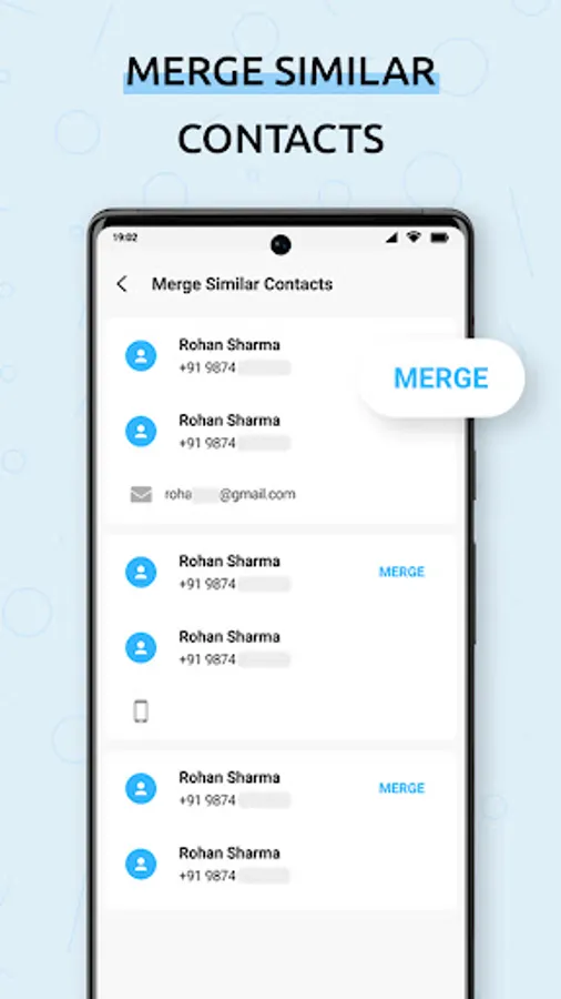 - Merge contacts by similar name or merge by similar phone number.