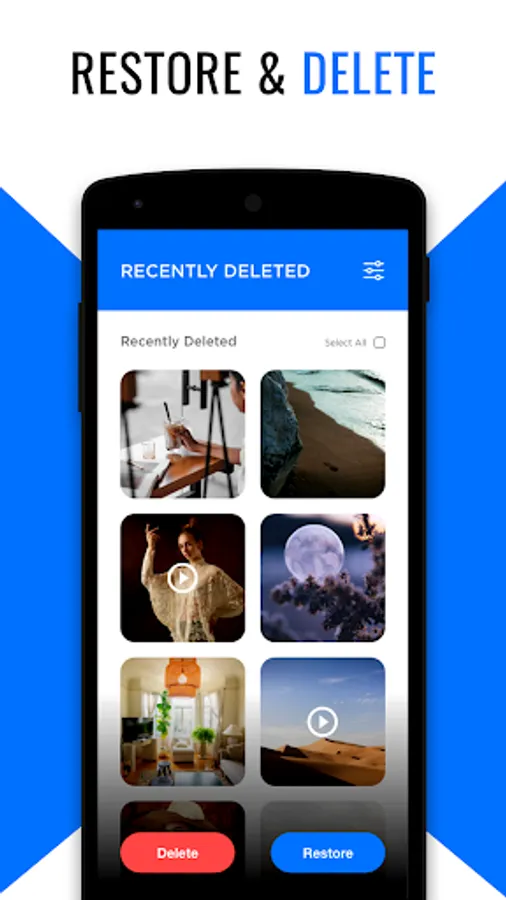 This photo recovery app will solve this problem for you. Recover deleted videos will scan all your phone storage looking for deleted undelete photos & list them in an easy manner that will help you to restore them back to your phone storage.