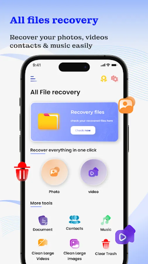 All Recovery - Photos & Videos: File Recovery app allows users to recover deleted photos, deleted videos, deleted audio files, deleted contacts and documents from both the internal memory and the SD card from their Android devices without the need for a computer.