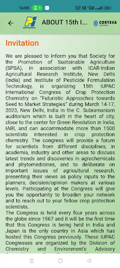 We are pleased to inform you that Society for the Promotion of Sustainable Agriculture (SPSA), in association with ICAR-Indian Agricultural Research Institute, New Delhi (India) and Institute of Pesticide Formulation Technology, is organizing 15th IUPAC International Congress of Crop Protection Chemistry on “Futuristic Approaches towards Seed to Market Strategies” during March 14-17, 2023, New Delhi, India in the C. Subramaniam auditorium which is built in the heart of city, close to the center for Green Revolution in India, IARI, and can accommodate more than 1500 scientists interested in crop protection chemistry. The congress will provide a forum for scientists from different disciplines, in academia, industry and other areas to discuss latest trends and discoveries in agrochemicals and phytomedicines, and to deliberate on important issues of agricultural research, presenting their views as policy inputs to the planners, decision/opinion makers at various levels. Participating at the Congress will give you the opportunity to broaden your network and to reach out to your fellow crop protection scientists