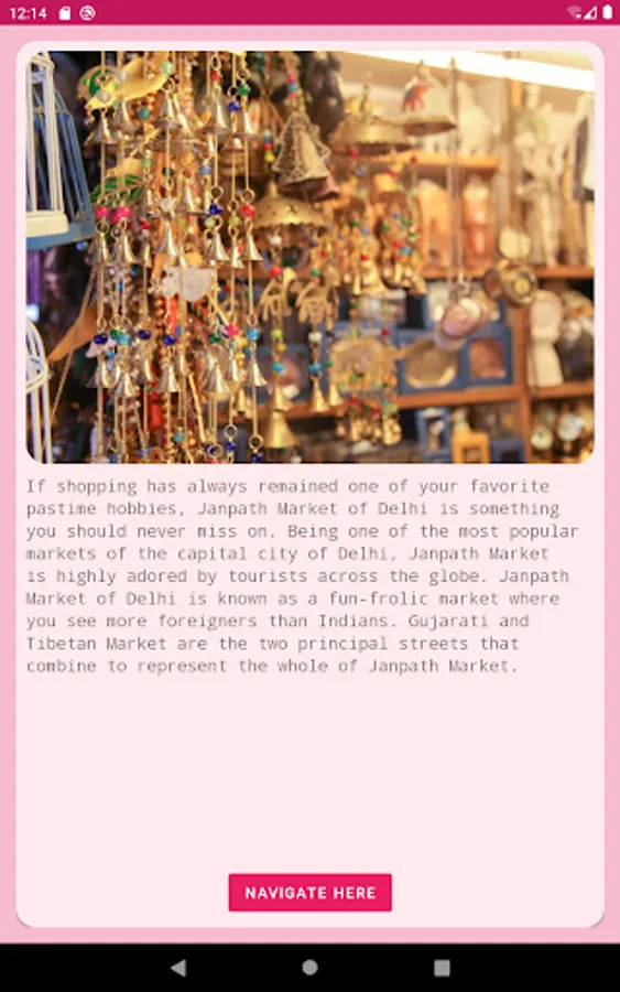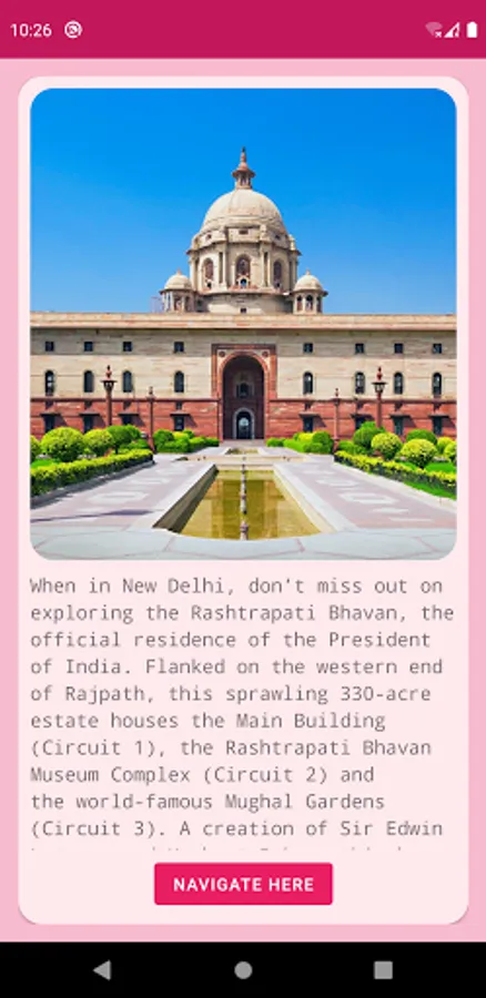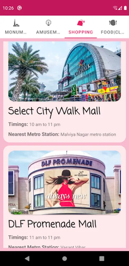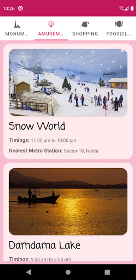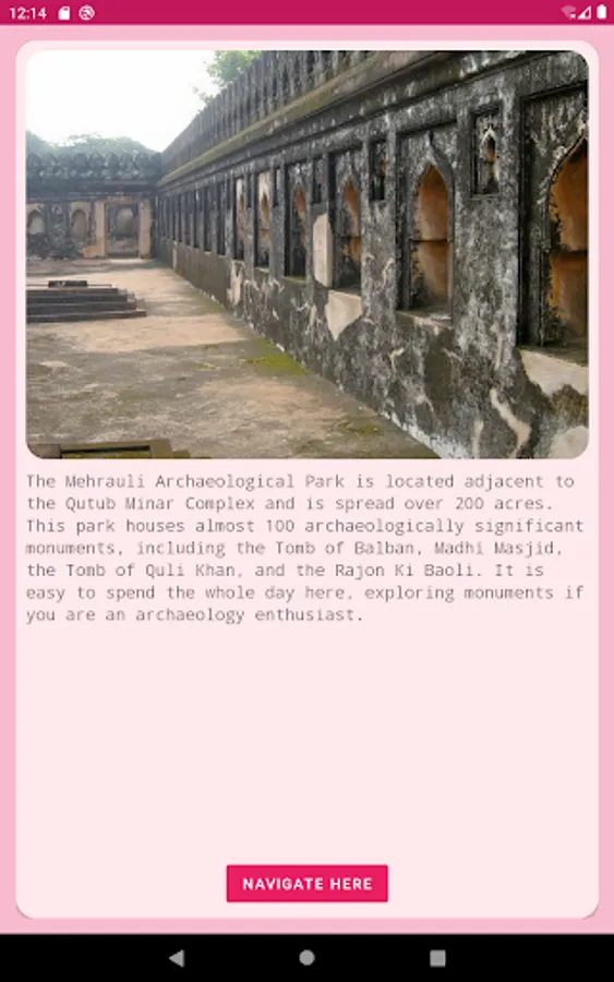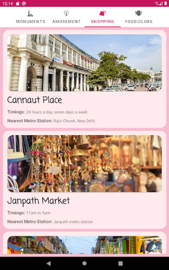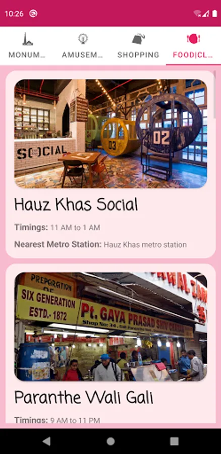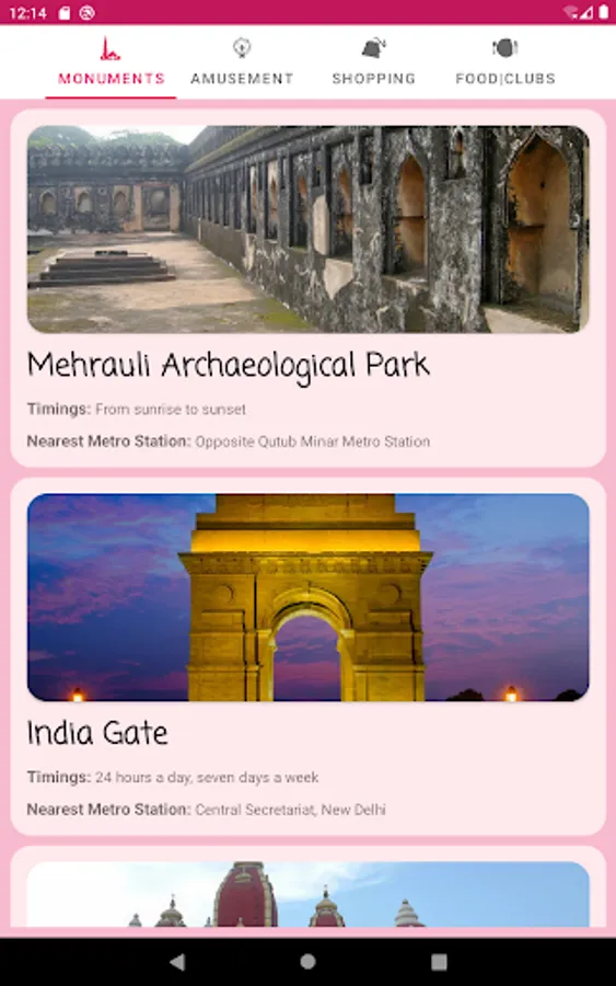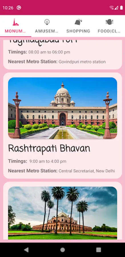The app shows important details like Timings and nearest metro location in card view and on expanding it shows a small description or history about the place.