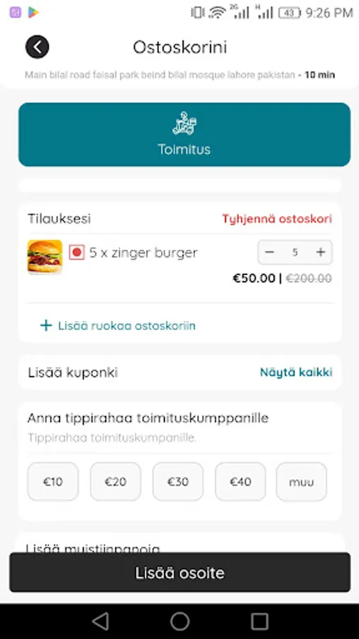- Delifin-ruoan toimitussovelluspalveluiden avulla käyttäjät voivat tilata tuoretta ravintolaruokaa toimitettavaksi useisiin osoitteisiin joustavuuden vuoksi, kuten koti- ja työpaikkaosoitteet kassalla.