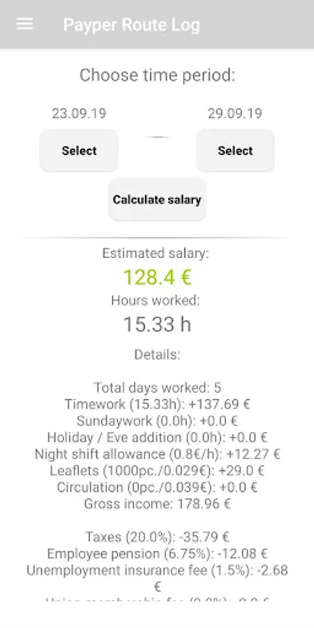 App calculates your work time based on the time information for each day from all the routes you've delivered. App also gives you an estimate of your salary based on this work time with either prefilled or your own added payroll computation information.