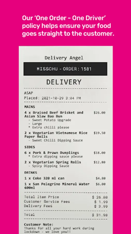Delivery Angel also has a ‘One Order One Driver’ policy, to help ensure the food goes straight to the customer’s door, without a surprise detour. We say ‘No!’ to batching orders and yes to maximum deliciousness!
