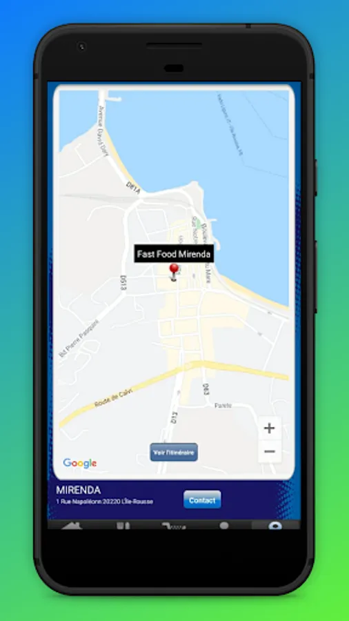 Cette application vous permet de pouvoir commander tous les produits du Fast Food Mirenda à l'Ile Rousse dans la région Balagne en haute-Corse et de le localiser.