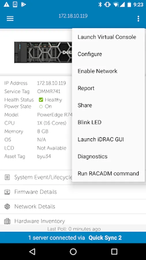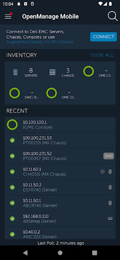 • Browse server or chassis details, health status, hardware & firmware inventory, networking details, and System Event or LC logs. (For MX7000 chassis, use Augmented Reality feature to monitor and troubleshoot easily and quickly.)