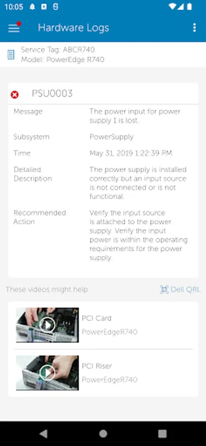 • Dell Quick Resource Locator (QRL) video remediation, available when connecting to an OpenManage Enterprise, server or chassis – displays context relevant videos about the hardware based on available error logs
