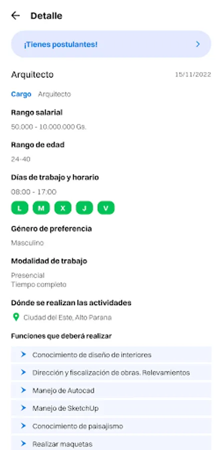 Find a job or hire a professional for your company quickly! The only Paraguayan App to find a job thanks to intelligent algorithms, you only have to upload your data and our matching intelligence will choose the best company according to your preferences or skills. Free for applicants! Economic for companies! Let an algorithm find the perfect job for you in record time!