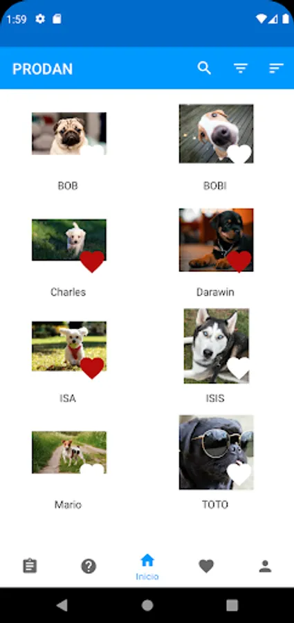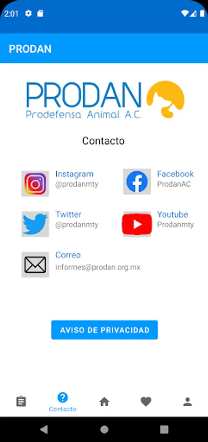 The app displays a list of animals from PRODAN, a Mexican animal relief organization, that users can select to view details, add to favorites, and request an app. On the other hand, it has a forms page, which connects to the PRODAN form, a contact page and a user profile, where they can upload images that are shared to PRODAN through Cloudinary.