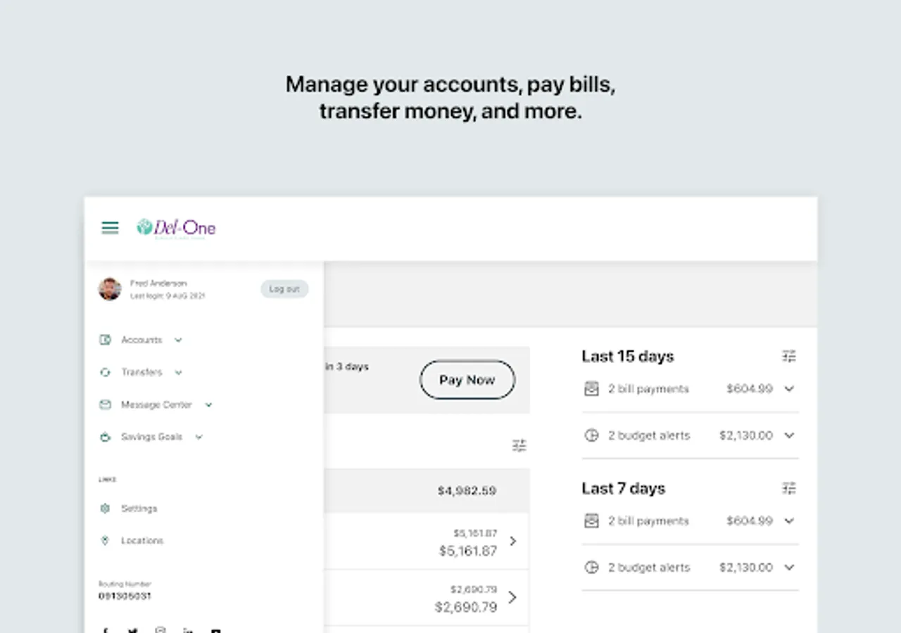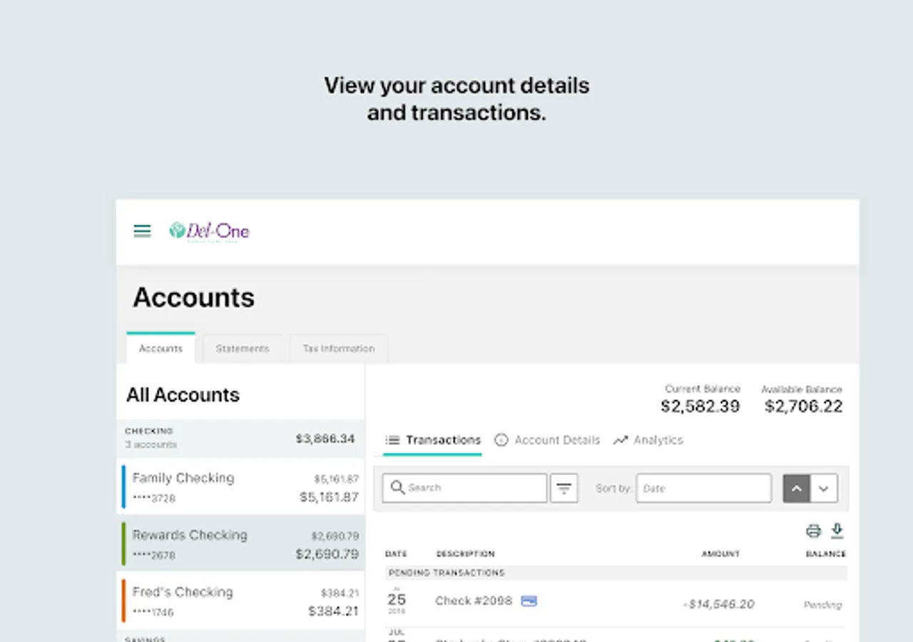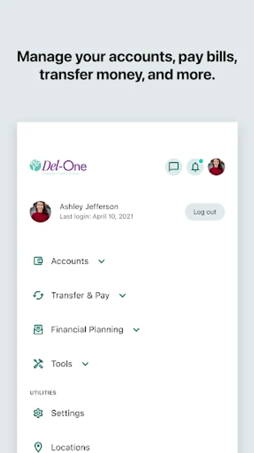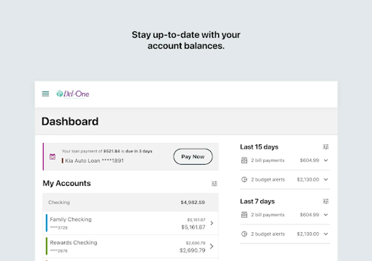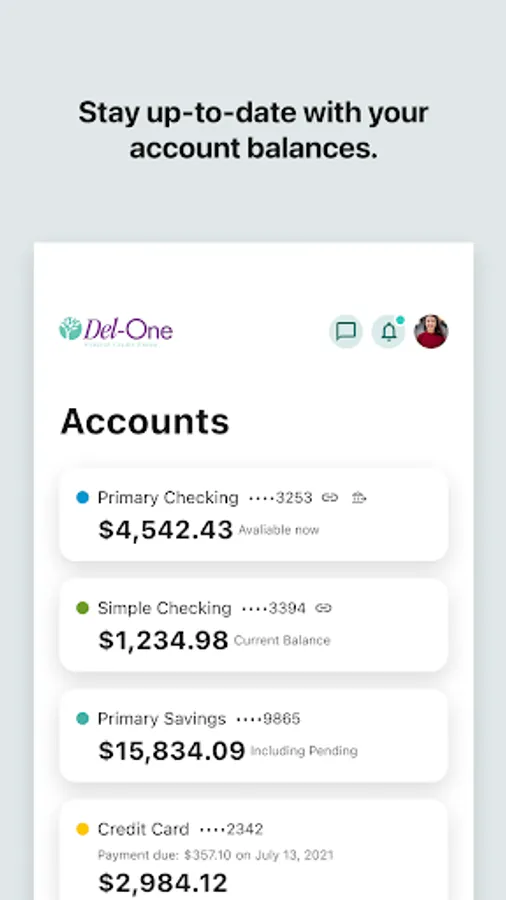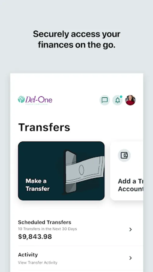 Del-One Mobile App is a secure, convenient way to access your accounts anytime, anywhere, using your mobile device. This application allows you to: