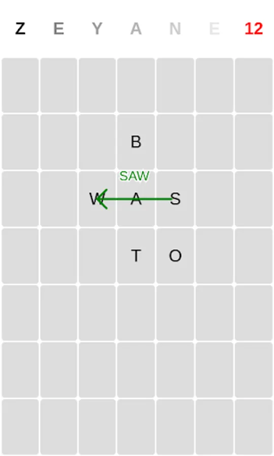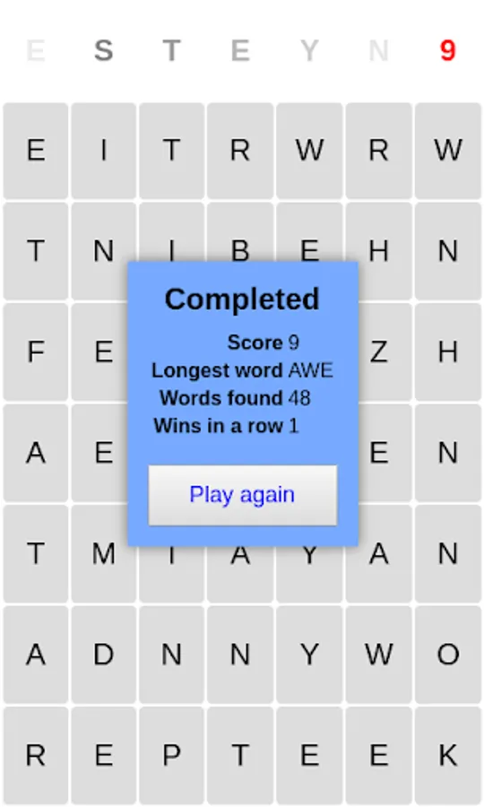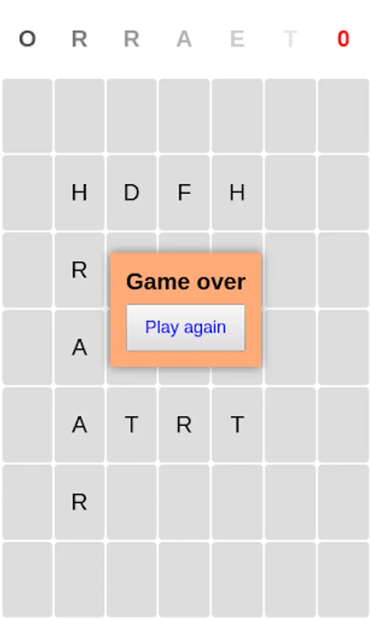 Place letters that appears on the top of the screen anywhere, when you create English word you get one point, otherwise you lose one point.