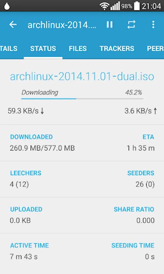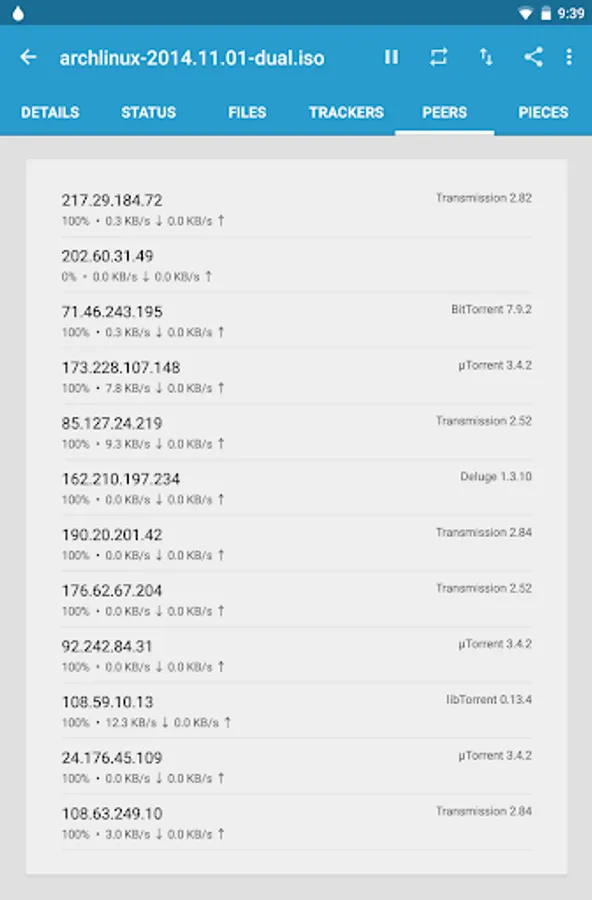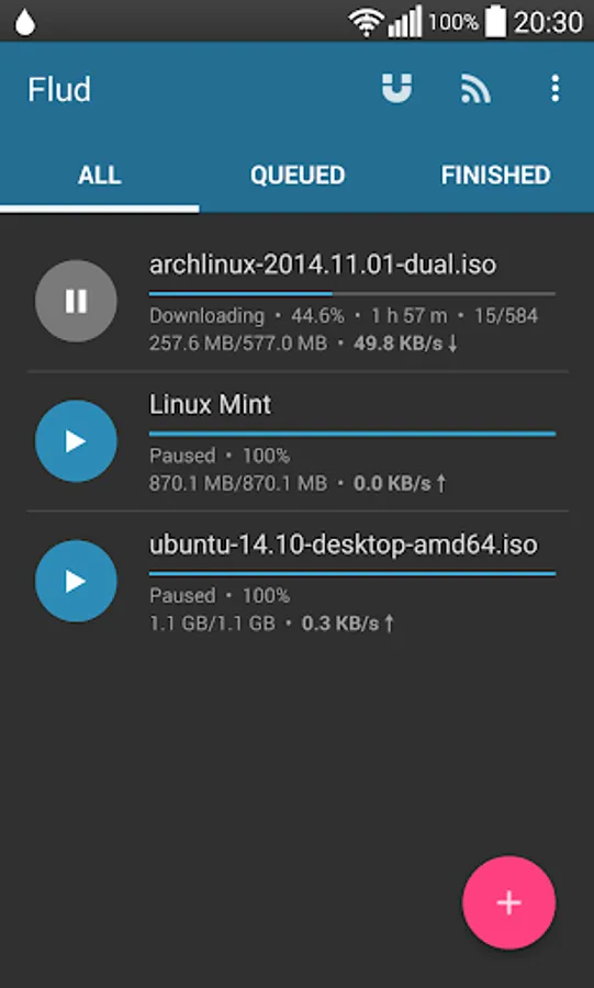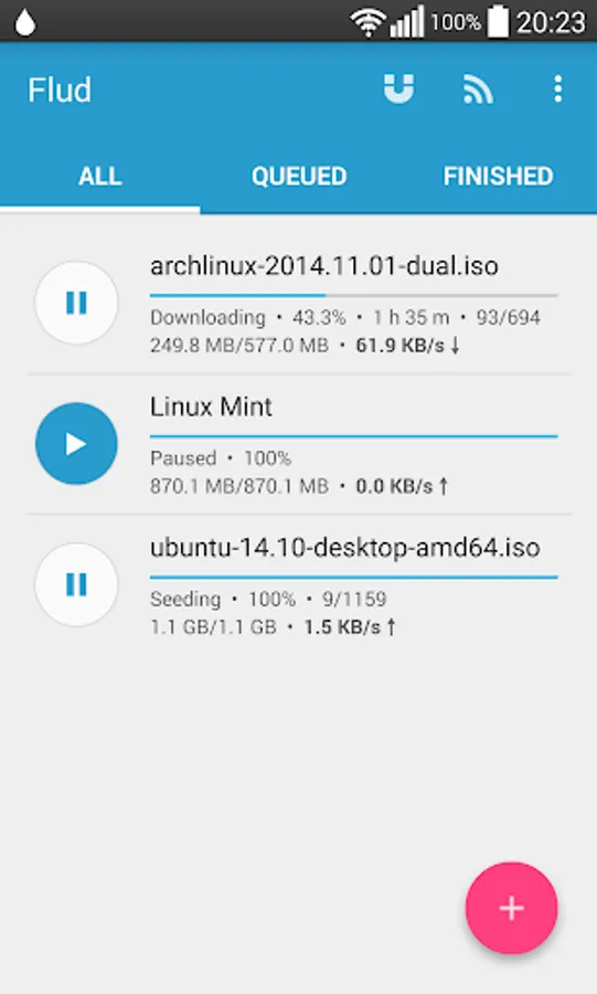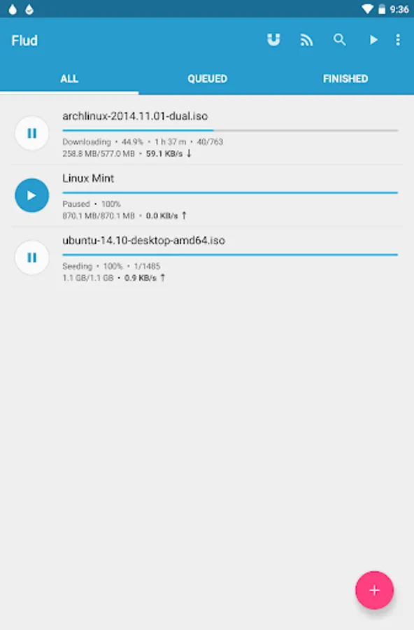 Flud is a simple and beautiful BitTorrent client for Android. The power of BitTorrent protocol is now in the palm of your hands. Share files with ease from your phone/tablet. Download files directly to your phone/tablet.