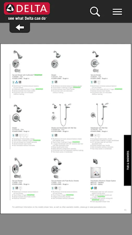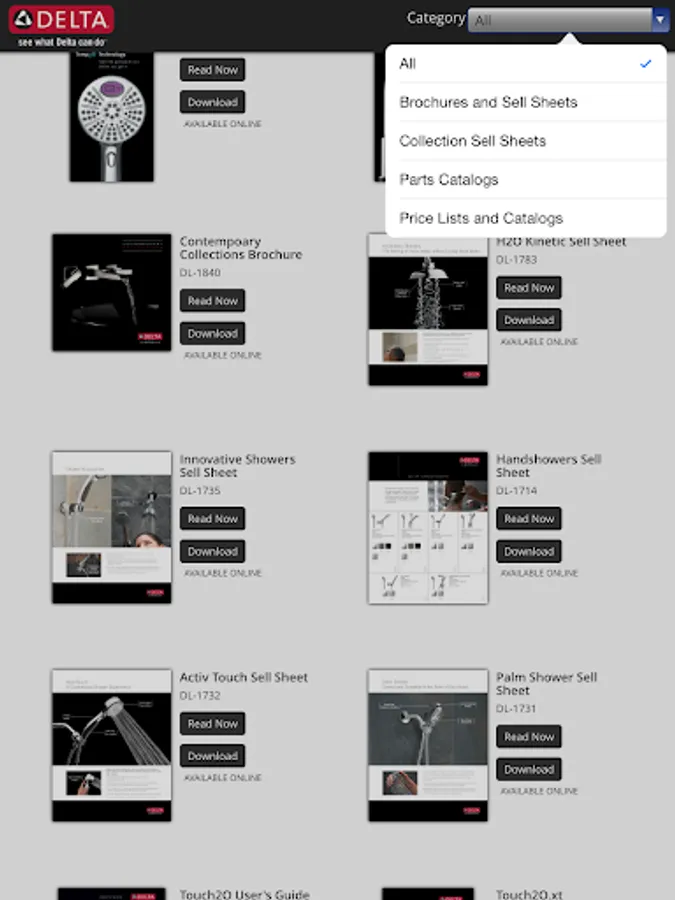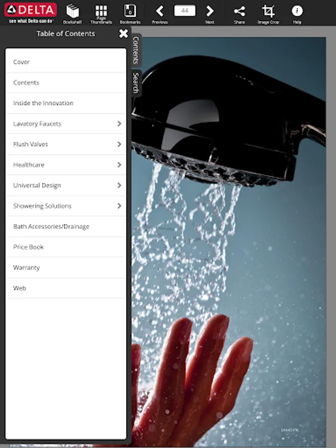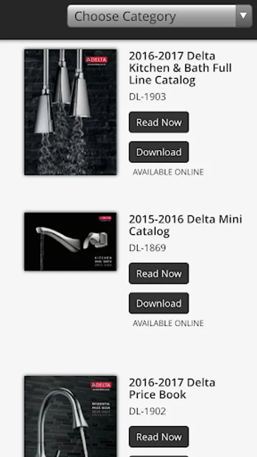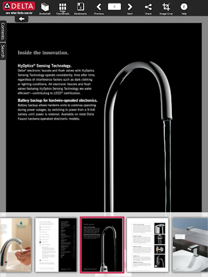 The Delta Faucet Catalogs App is your free, convenient source for interactive Delta Faucet product literature. It takes the place of paper catalogs to conveniently view pictures of Delta products, current product information, pricing, features and descriptions.  Immediately view interactive brochures, catalogs, collection sell sheets and more.  Or download for convenient viewing offline anywhere.  Tap a document to open it, flip the page with a swipe or tap, and pinch to zoom in and out for easy reading.