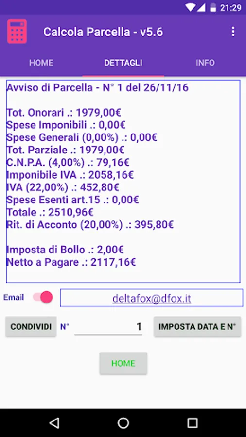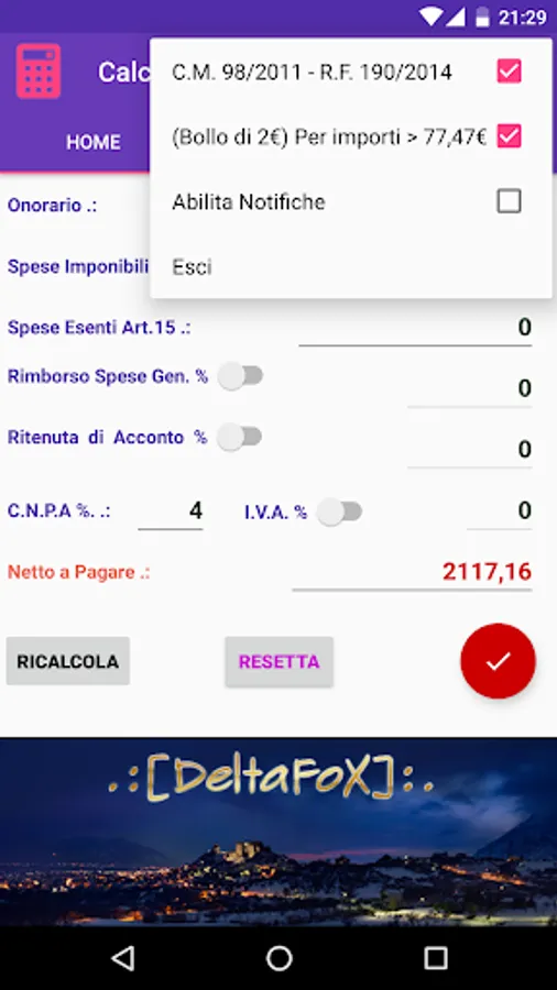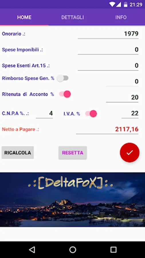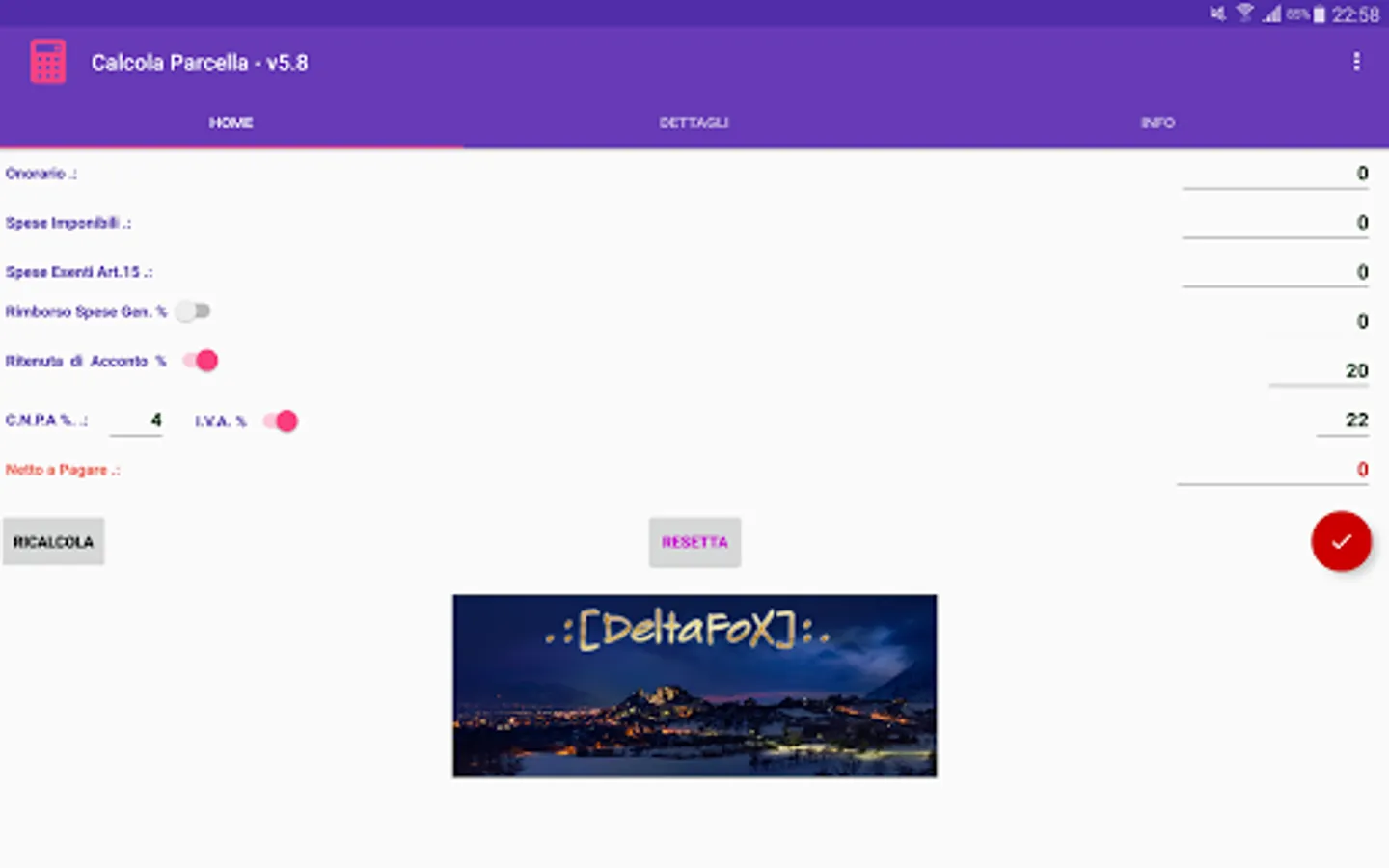 The app calculates the net to pay a bill with the details of the transactions simply by entering the fee and setting relevant areas to suit your needs. It 'also possible to reverse calculate net pay by entering the appropriate field and pressing the button recalculates so by obtaining the fee and details of the various items of the parcel.