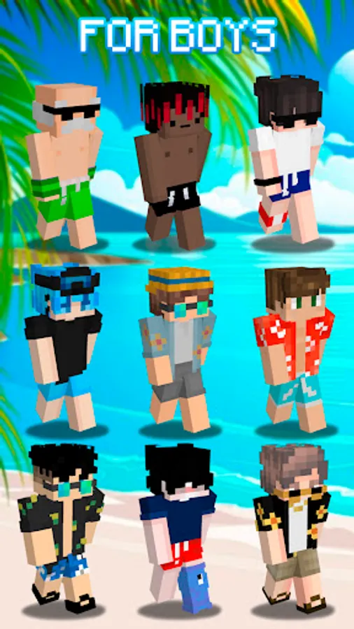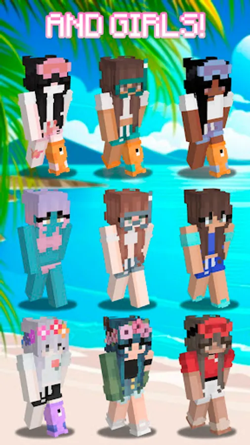 In this app we collected Hot Summer Skins for Minecraft. Here you will find a huge collection of cool skins for boys and girls with completely free! Save your favorite Skins then install them for your game world with instant install in one click and play with your friends!