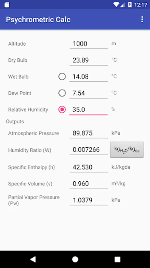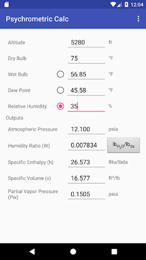 This Psychrometric Calculator allows you to compute moist air properties given only altitude, dry-bulb temperature and either wet-bulb, dew point or relative humidity.