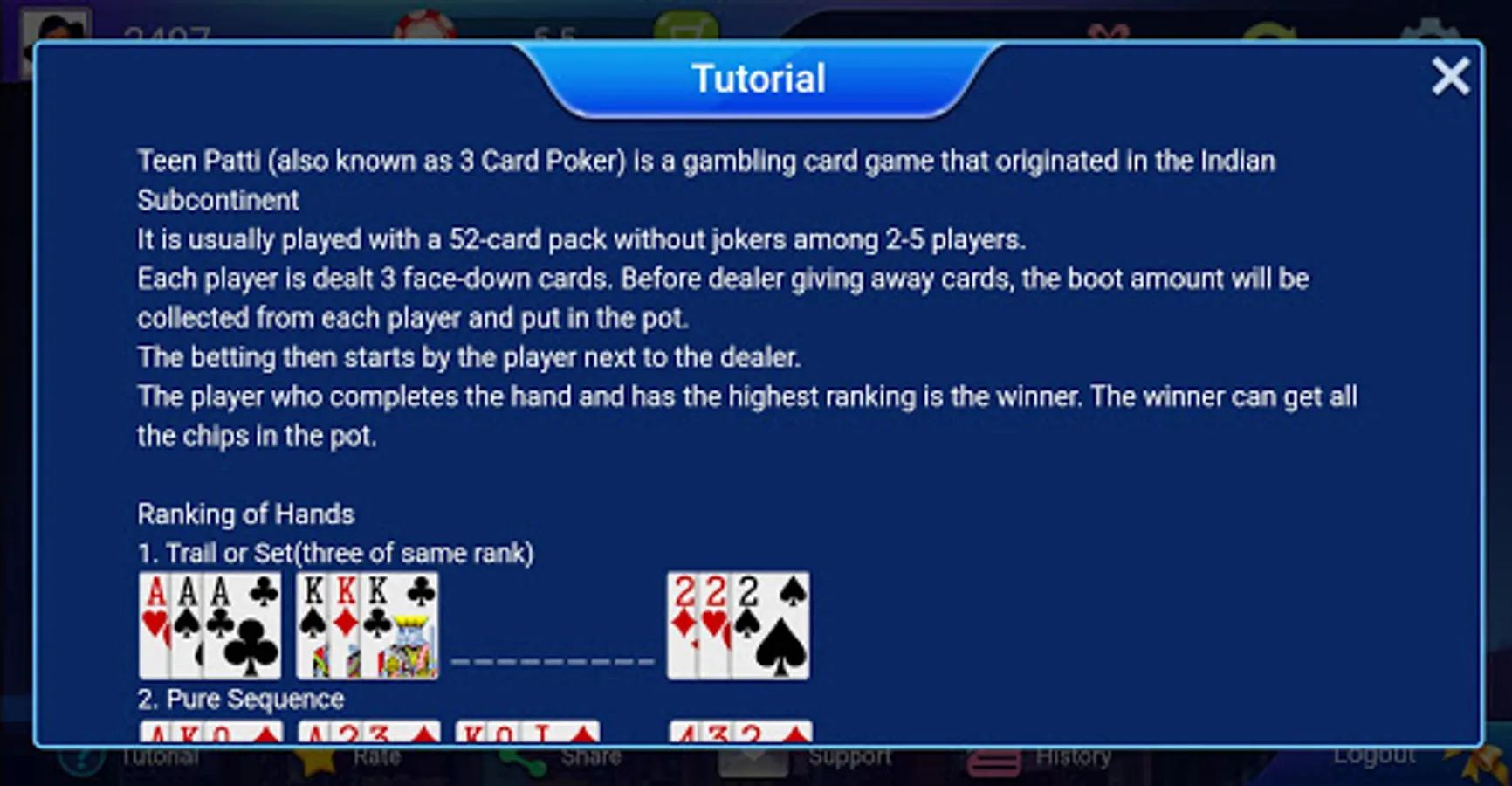 Play Teenpatti and other games in a fun way like never before. People often spell teen patti as tin patti, 3 patti, indian poker, tinn pati, tinpatti, poker, 3 card game, 3 card poker, etc.