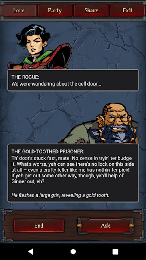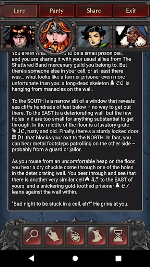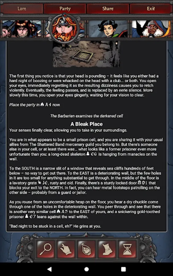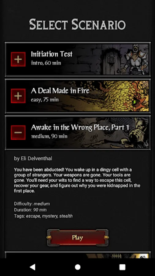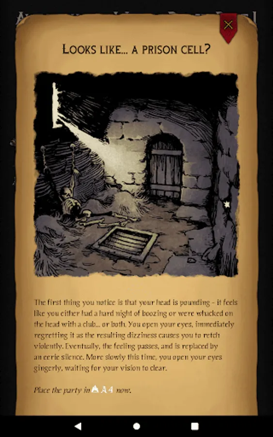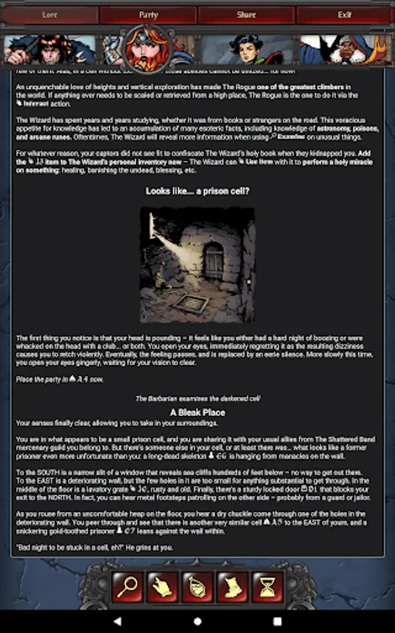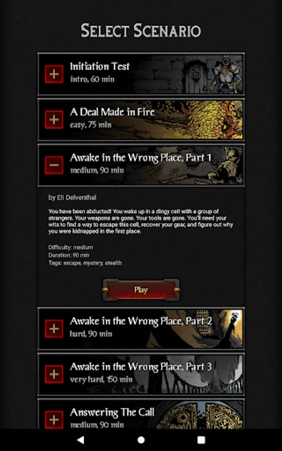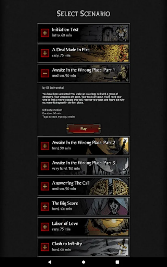 To begin, create a game with one of the ten included scenarios and invite your friends to join on their own device. The app will take it from there, guiding you on what board game pieces to lay on the table as you progress through your adventure. You interact with these pieces by scanning their QR codes. You can search the room for secrets, use your thief's tools to pick the locked cell door, or try to reason with the mad wizard. When a fight becomes unavoidable, use your custom combat deck to coordinate with your party and gain a strategic advantage. You will succeed based on your wits and how well you work with your party.