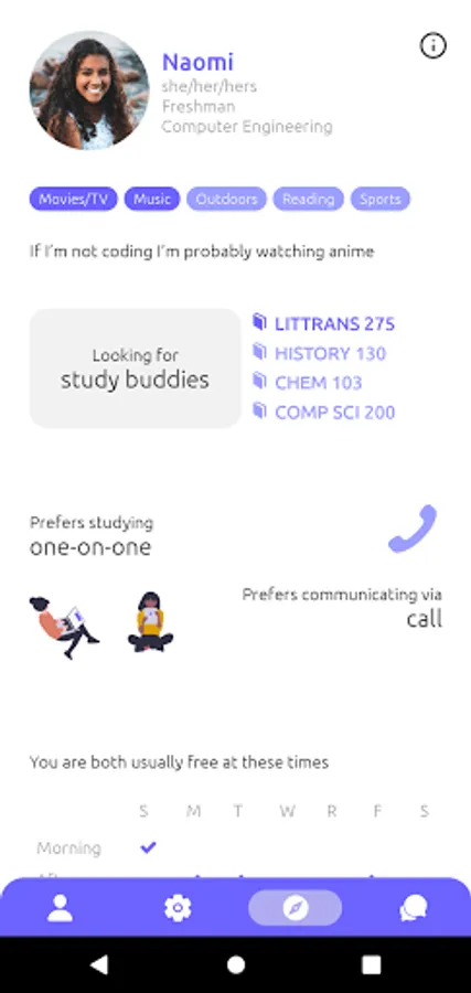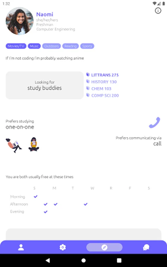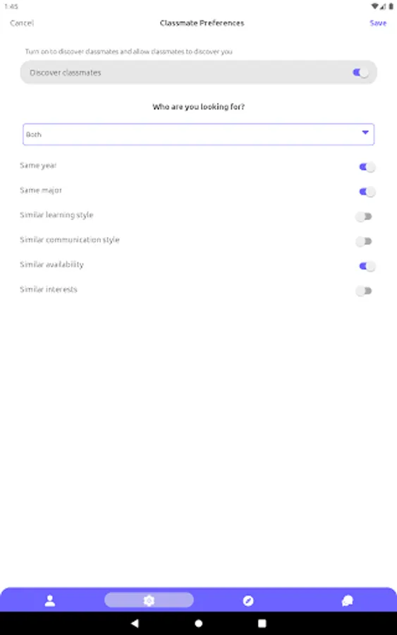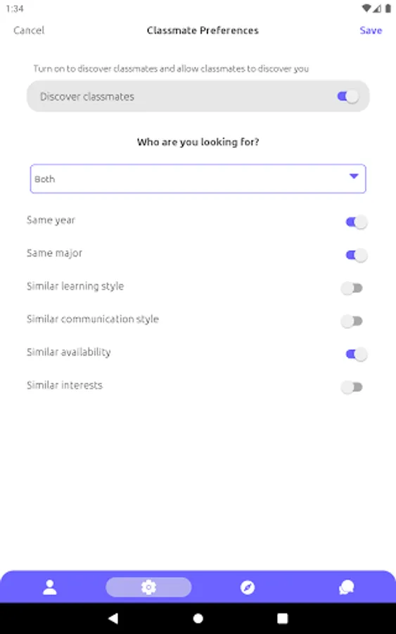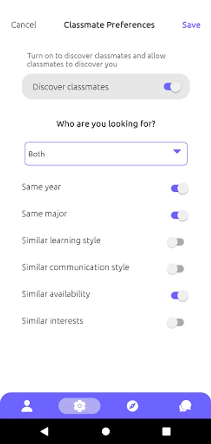 1. Choose which attributes (year, major, availability, interests, etc.) you prefer to have in common with classmates to discover your most compatible classmates first.