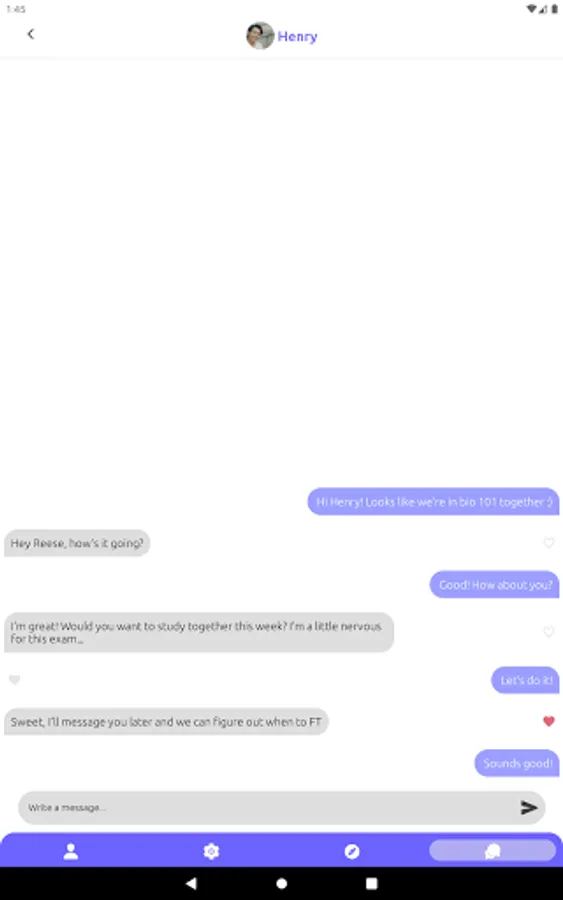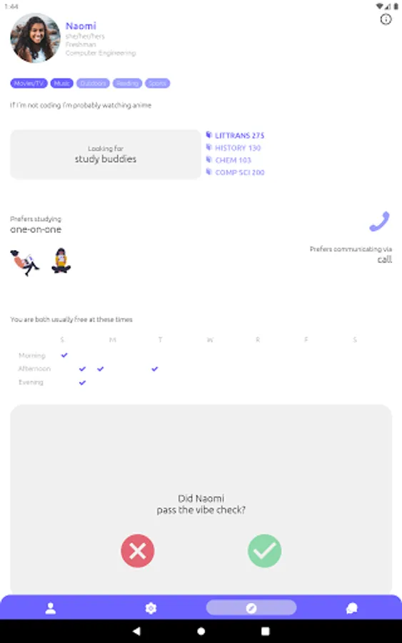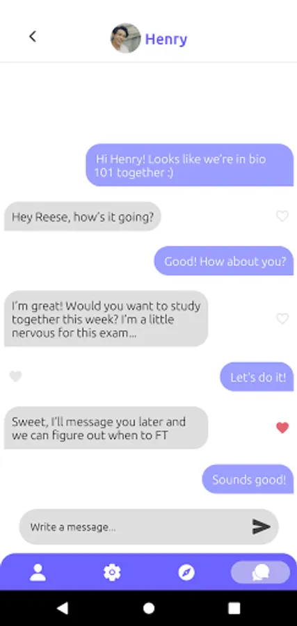 3. You’ll be matched with a classmate if you both pass each other's vibe check. Message your matches with confidence knowing there is mutual interest :)