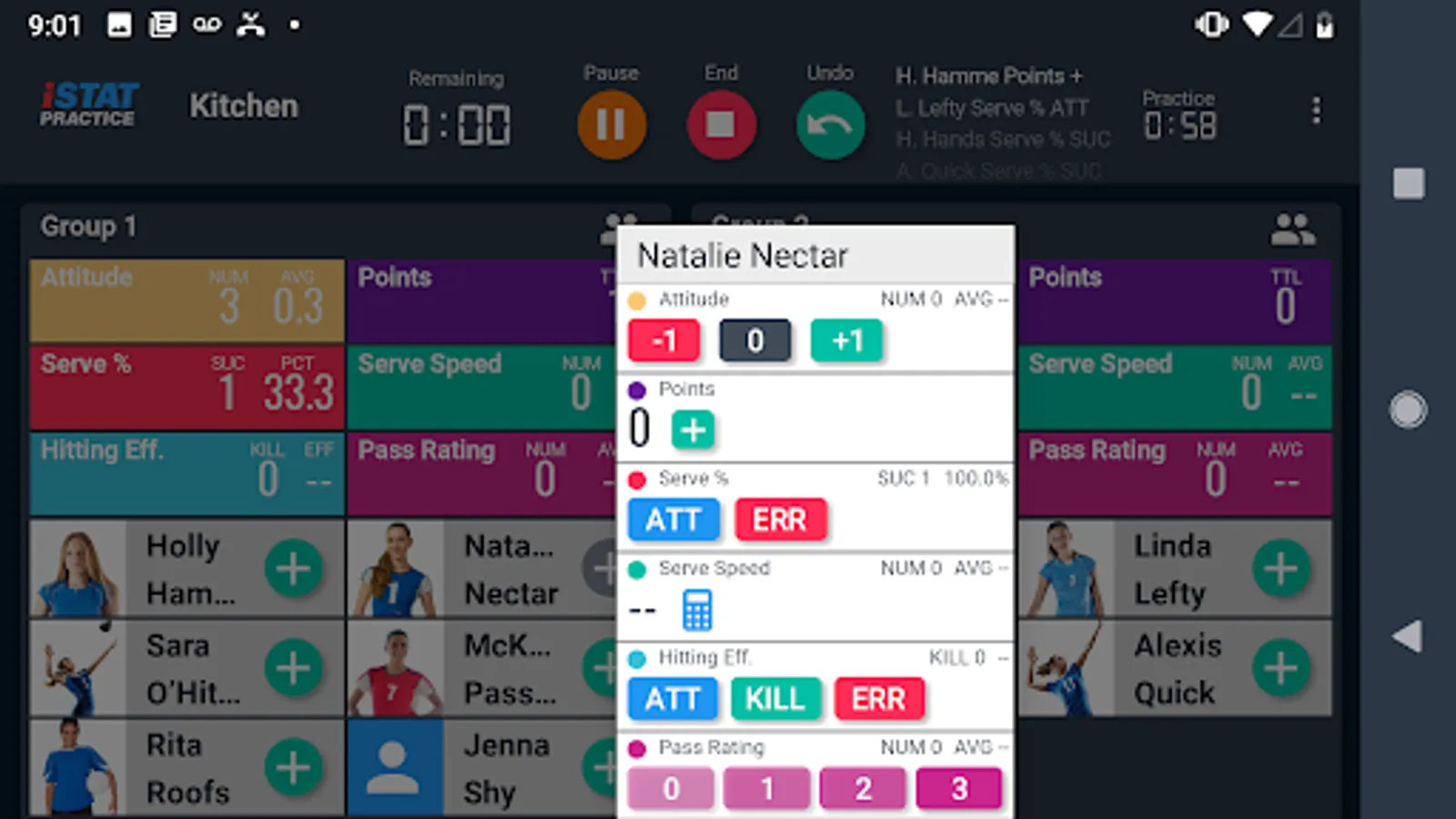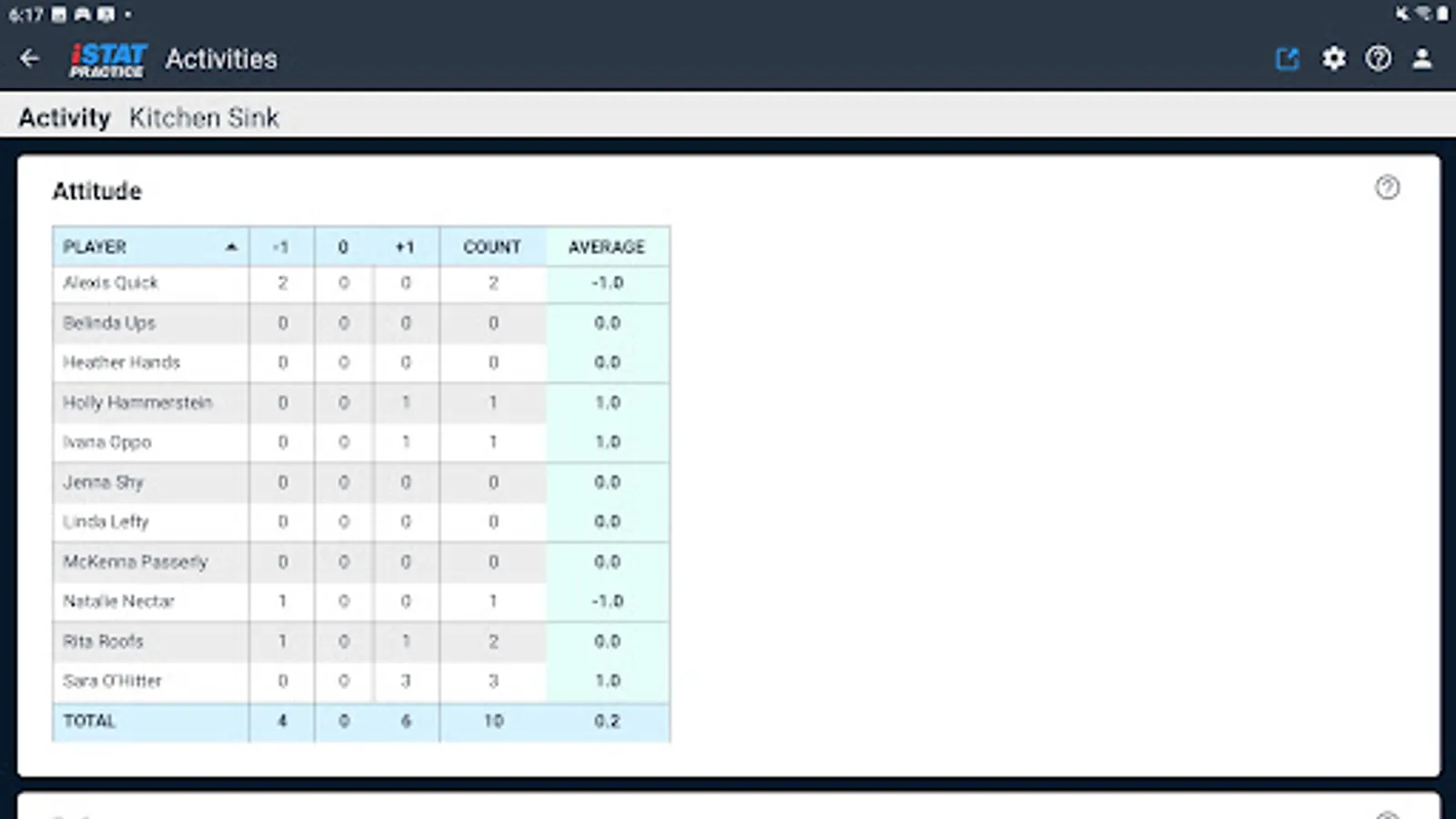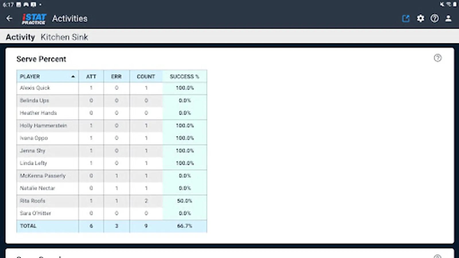 iStatPractice allows you to track metrics for all your skills and drills, and then analyze them for just an individual drill, or across a practice, across an entire season, or even across an entire career.