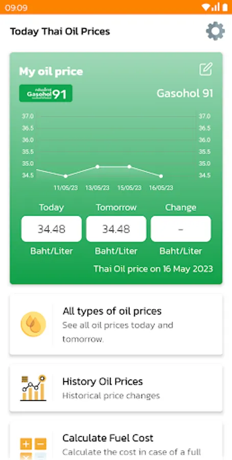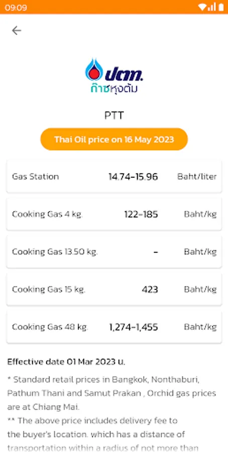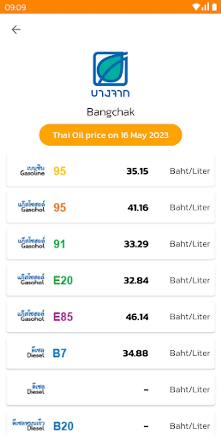 Thai Oil Price Application. Update the price of thai oil Petrol & LPG prices today and tomorrow all thailand gas staion. This application helping you to plan your refueling in daily life. Thai oil price have information from thai service provider such as PTT, Bangchak, Shell, Esso, Caltex, IRPC, PT, Pure, Cusco, Cusco dealers and more. Thai Oil Price is very easy to use. You can select gas station from service provider list and select types of petrol including Gasohol 95, Gasohol E20, Gasohol E85, Gasohol 91, Petrol 95, Diesel, NGV Gas, Premium High Speed Diesel. You can check Today's oil price and tomorrow.