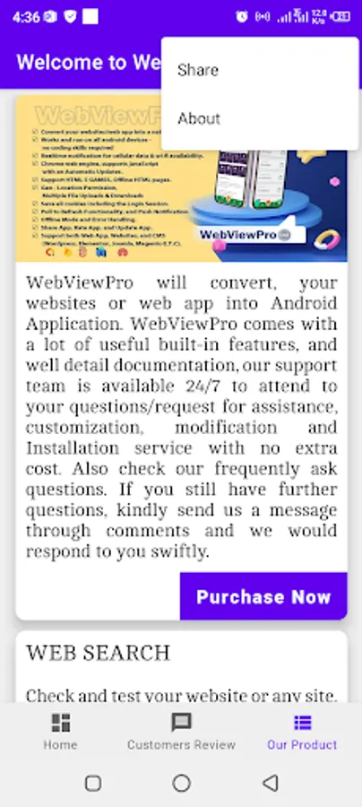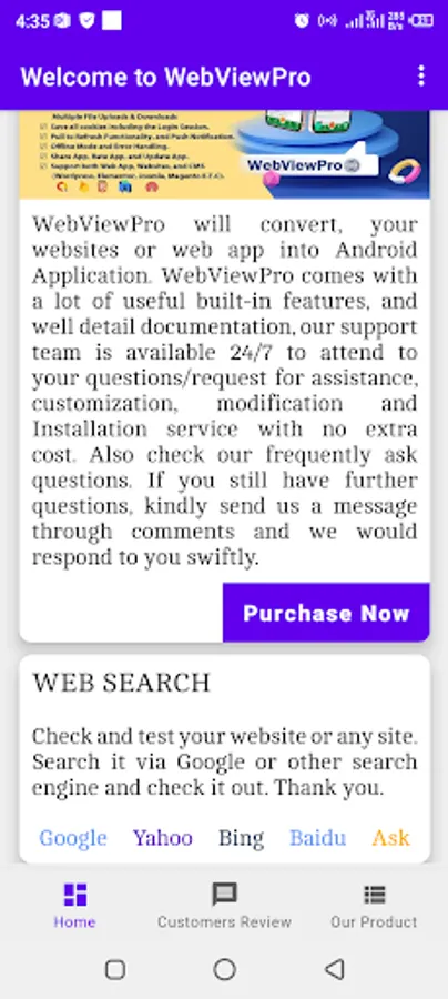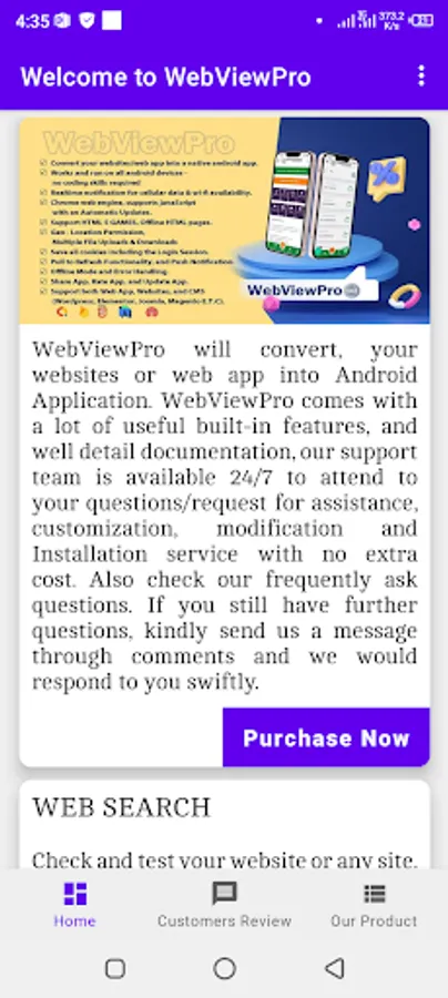 WebView Pro comes with a lot of useful built-in features and well detail documentation, and our support team is available 24/7 to attend to your questions/request for assistance, customization, modification and Installation service with no extra cost. Also check our frequently ask questions. If you still have further questions, kindly send us a message via comments and we would respond to you swiftly.
