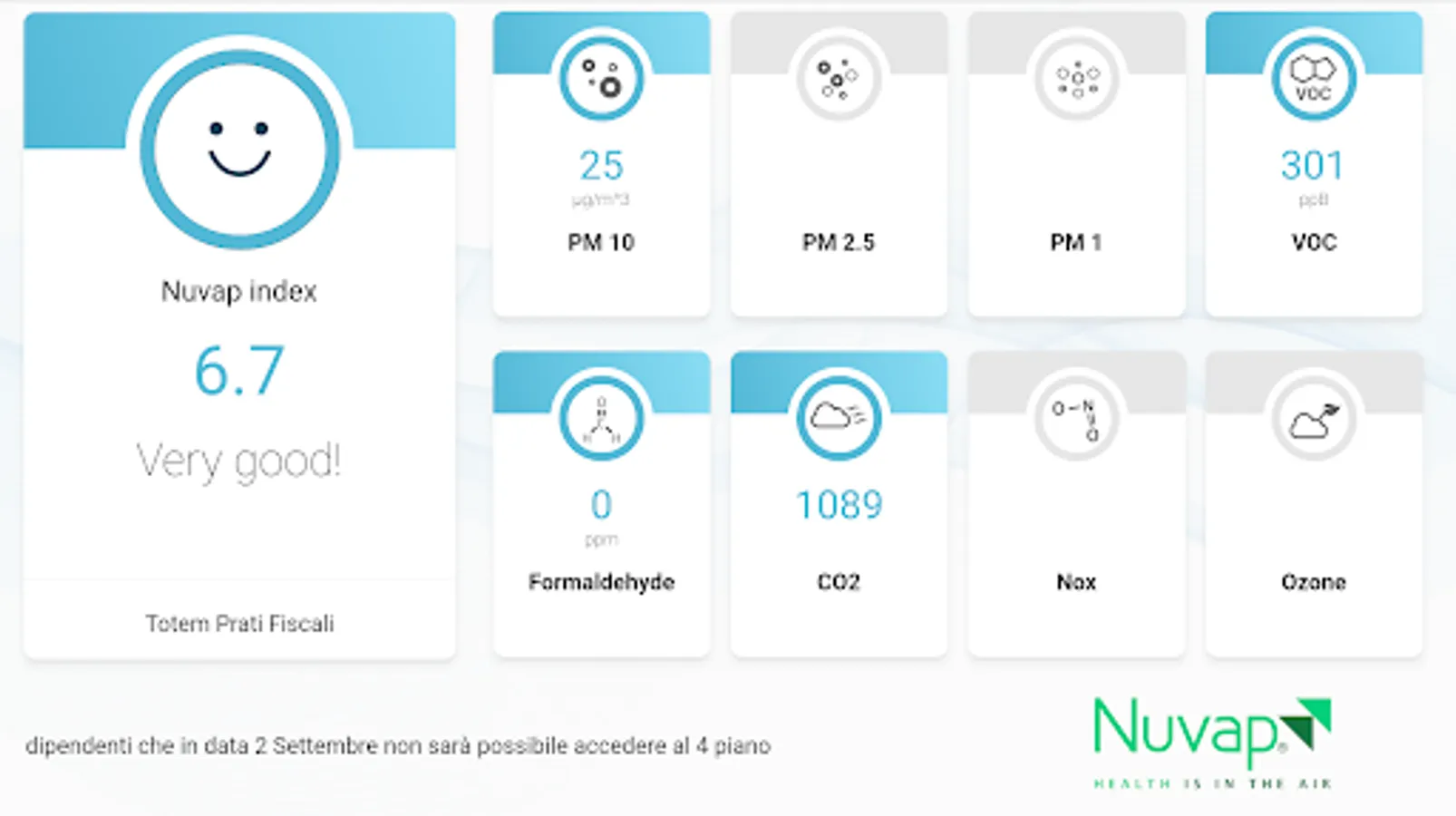 The Totem Mobile APP allows dedicated monitoring for NUVAP premium customers, a single dashboard that allows a view for a specific grouping of sensors from multiple locations. The solution can be installed on a set of devices (e.g. TV, Android tablet, etc.) to allow video viewing of the parameters.