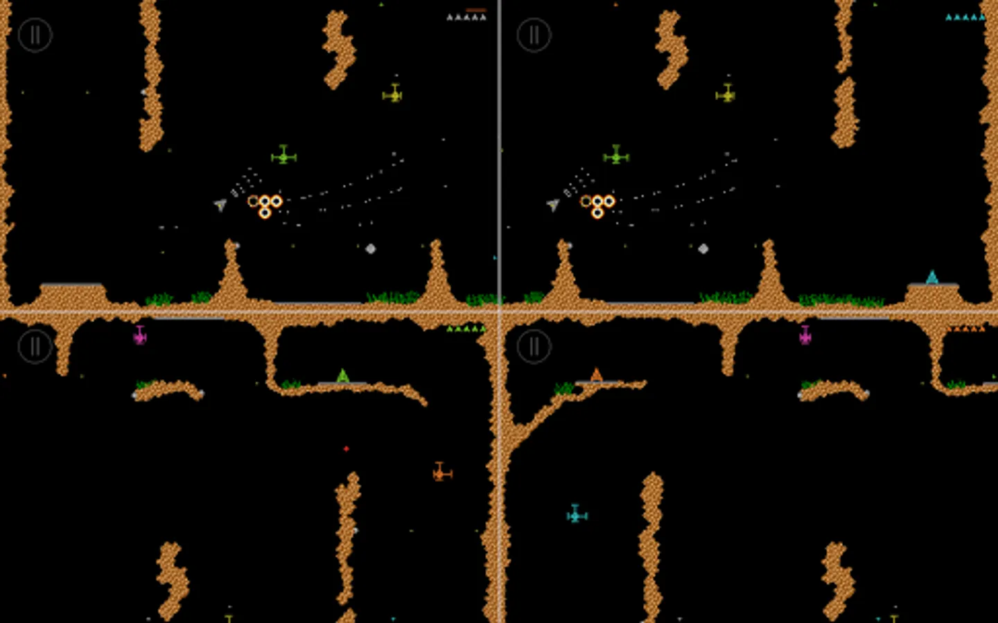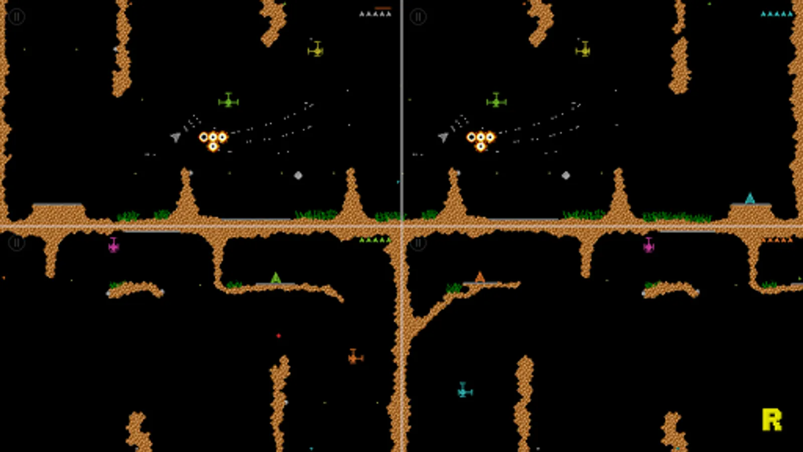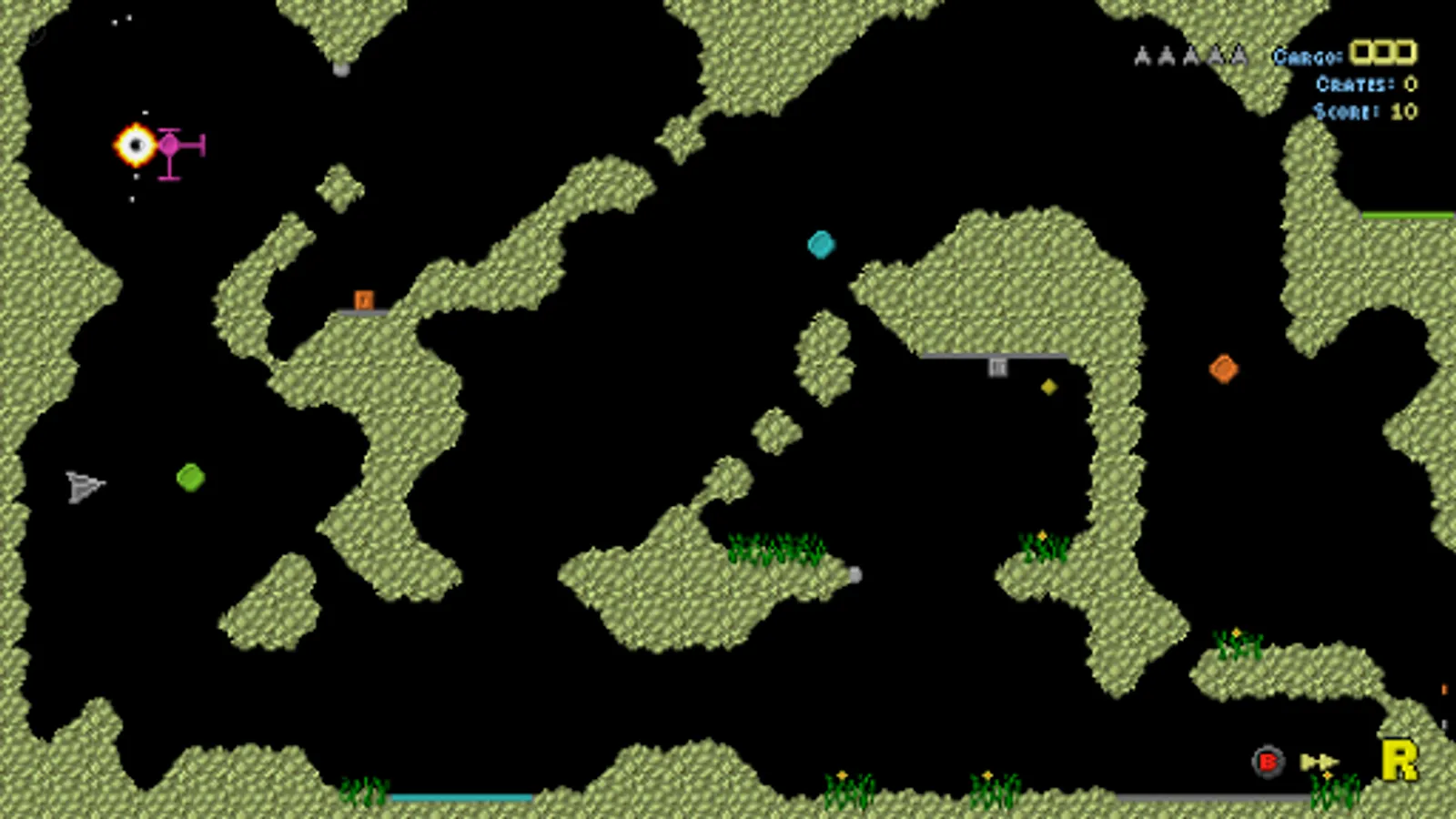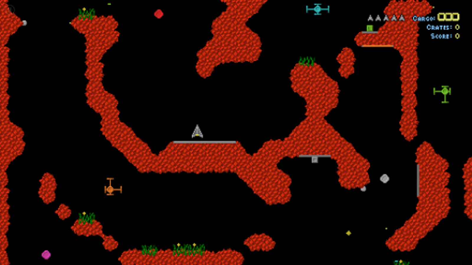 Super Grav is a retro gravity cave flyer for 1-4 players, featuring single player or co-op multiplayer missions, racing and dogfighting.
