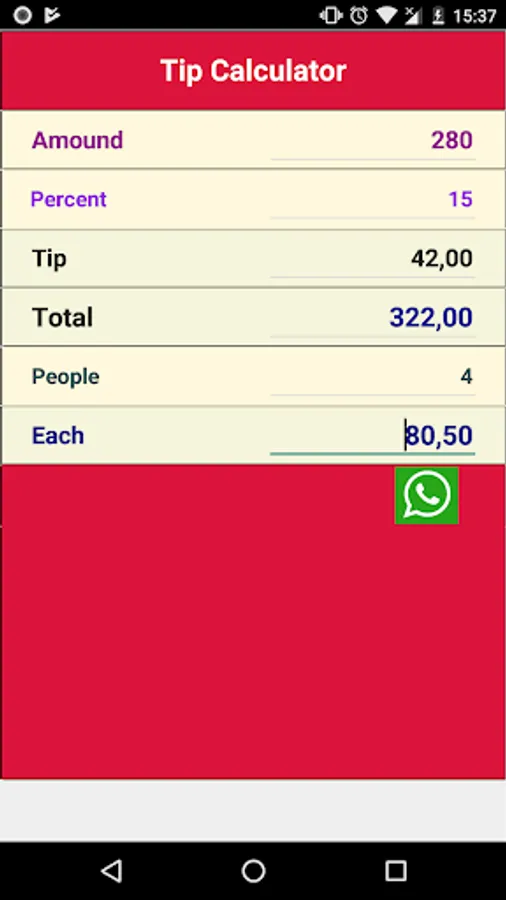 With Tip Calculator, you can add a tip to the total handle you want, and you can break it up with your friends. Share with WhatsApp