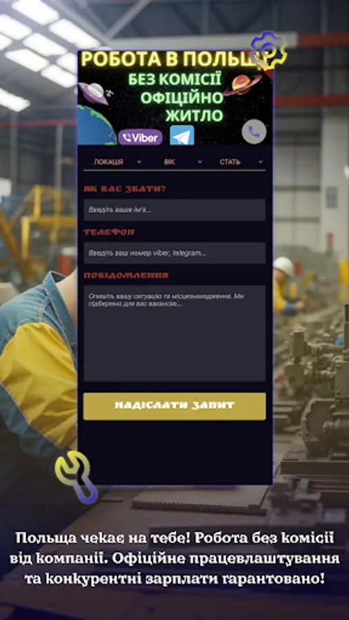 Download our application and easily find a job in Poland without extra costs and commissions. We provide access to vacancies with official employment, as well as housing offers. Forget about the stress of looking for a job - we will help you find the perfect opportunity to work and live in Poland. The app is available for free, download right now and start your successful career!
