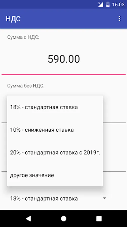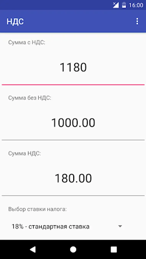 This application is a simple VAT calculator. It allows you to calculate the total amount, the amount to be paid to an individual and the amount of tax payable.