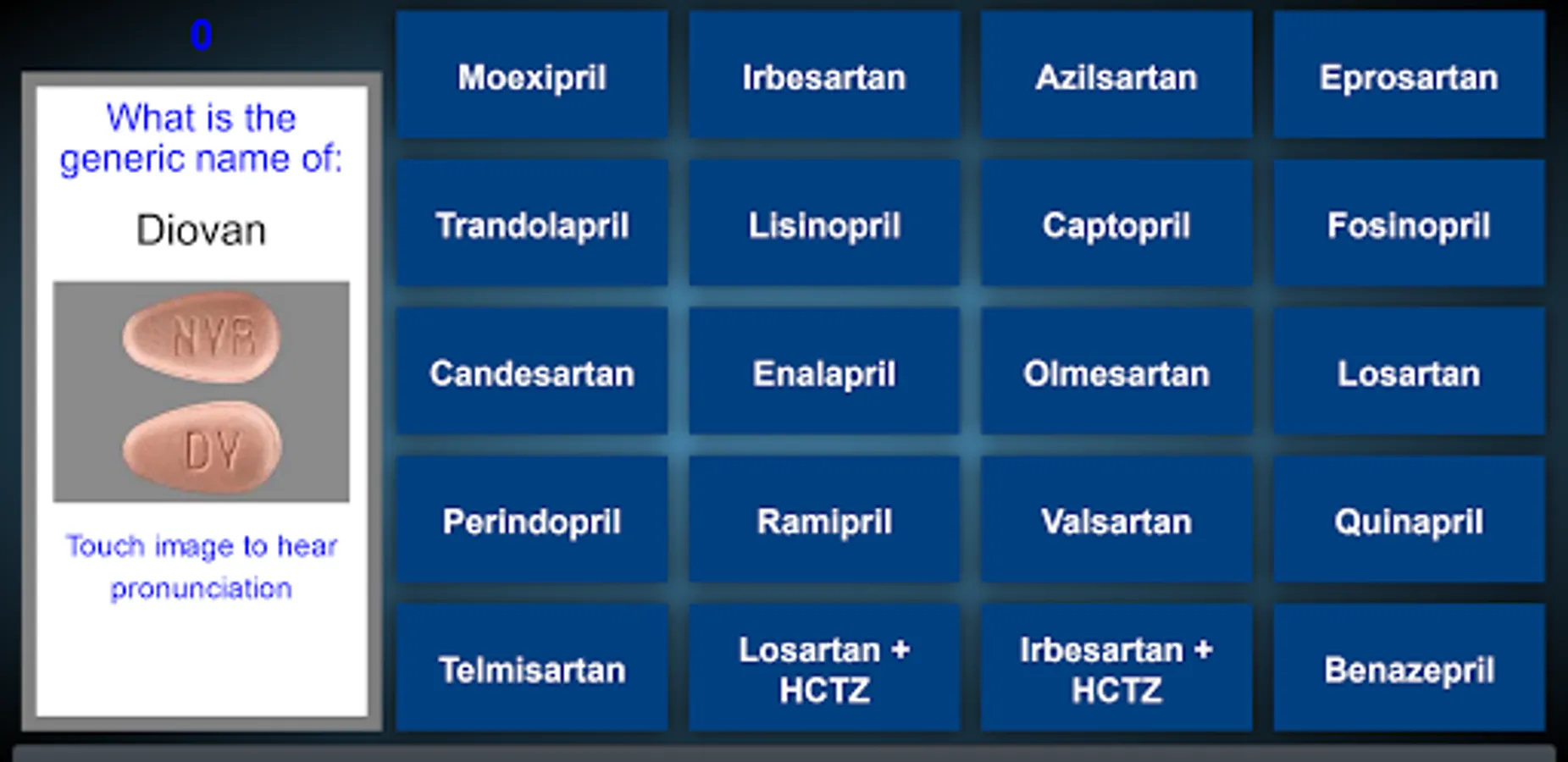 Play Denali Rx's cardiovascular matching game demo to help master the cardio drugs. You can play by choosing Generic-to-Brand or Brand-to-Generic. The drug pronunciations are also included, just click the drug image to hear them. This game will help you pass the Pharmacy Technician Certification Exam. Helpful for Pharmacist, Pharmacy Techs, Nurses, Medical Techs, Medical School, RN, LPN, CNA, and many other health care fields.