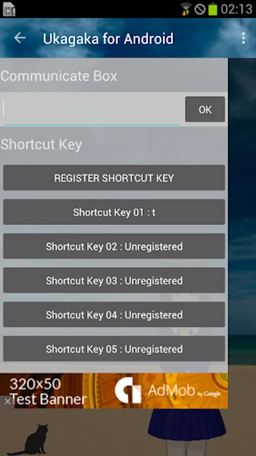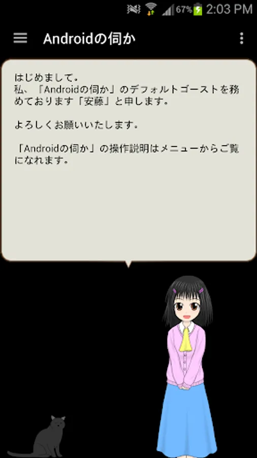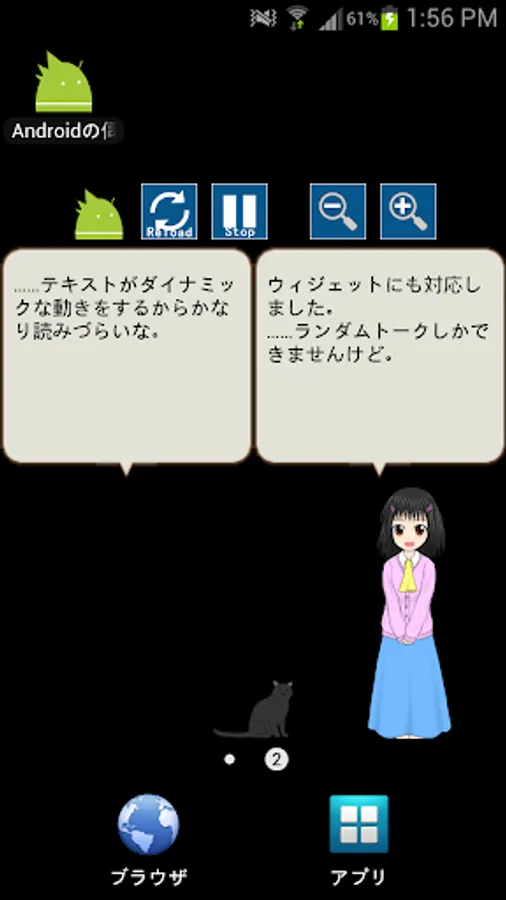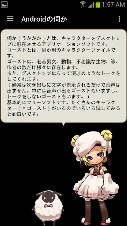 To finish the front display, tap notification of "Ukagaka for Android is displayed on the front." on the notification bar or start the application "Ukagaka for Android" (When displaying the application, the front display is automatically It ends in.)
