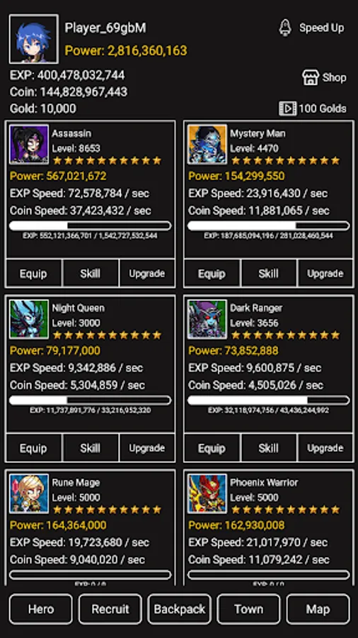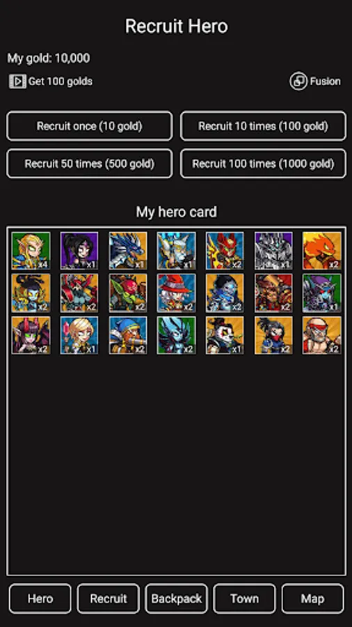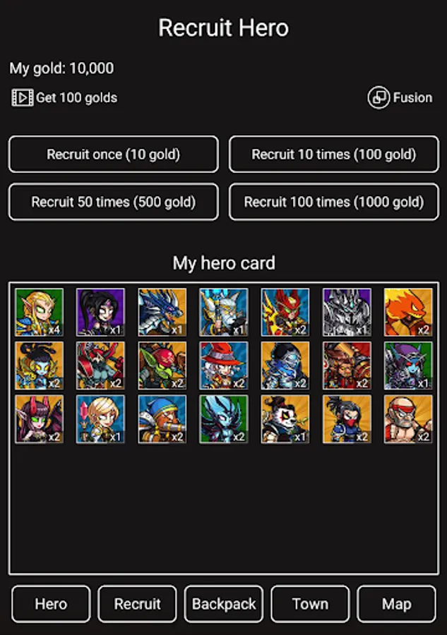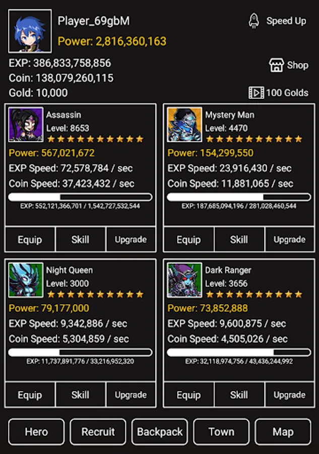 Improve the power of heroes by upgrading heroes, equipment strengthen, equipment collection, hero skill, hero's star-upgrade, training, etc.