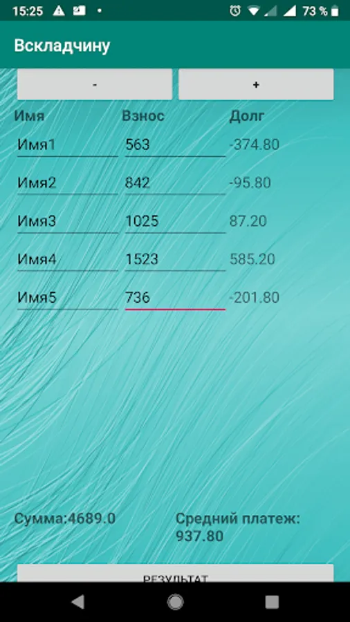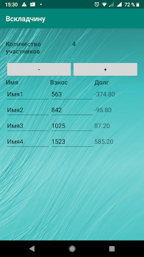 It is enough to enter the names and in front of each name the amount that each person contributed to the event. Then we click the Result button and we get the total amount of expenses, and also in the Debt column the amount that each participant of the event should pay to the general cashier. A negative value of the debt means that the participant must make a contribution to the general cashier, positive that the participant can withdraw this amount from the public cashier. The application also has a built-in calculator, to find it just scroll the screen down.