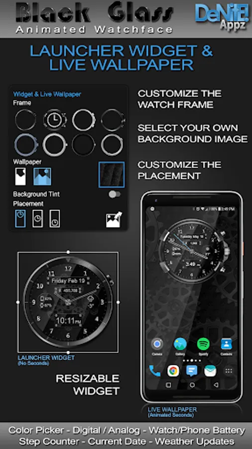 This completely customizable interactive HD Wear OS Watch Face, Clock Widget & Live Wallpaper brings a classic elegance to your wrist and Launcher. With animated gears you will be sure to catch the eye of every onlooker! Features include custom complications, battery levels, weather conditions, step counter, color picker & date information. A settings app will also be installed on your mobile device to configure the watch face for any look you desire. Select any color and create a completely custom look for yourself! Don't have a Wear OS watch? No Problem! You can use the clock widget or Live Wallpaper on your launcher!