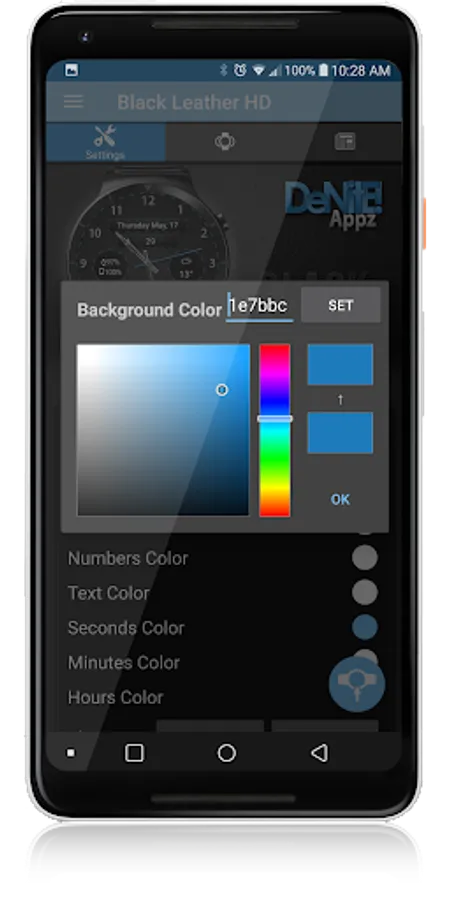 ✔ Color picker to select any color you like for the background, clock hands, text, & numbers