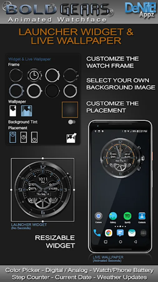 This completely customizable interactive HD Wear OS Watch Face, Clock Widget & Live Wallpaper brings a classic elegance to your wrist and Launcher. Features include custom complications, battery levels, weather conditions, step counter, color picker & date information. A settings app will also be installed on your mobile device to configure the watch face for any look you desire. Select any color and create a completely custom look for yourself! Don't have a Wear OS watch? No Problem! You can use the clock widget or Live Wallpaper on your launcher!