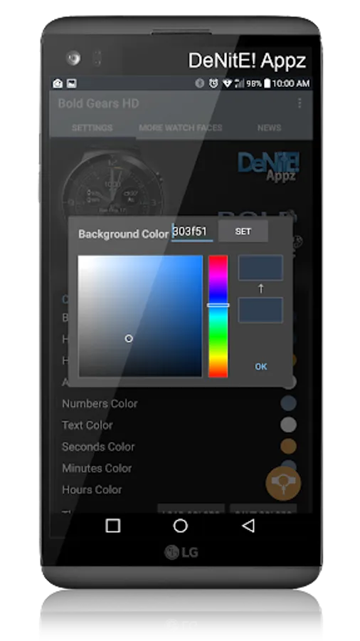 ✔ Color picker to select any color you like for the background, clock hands, text, & numbers