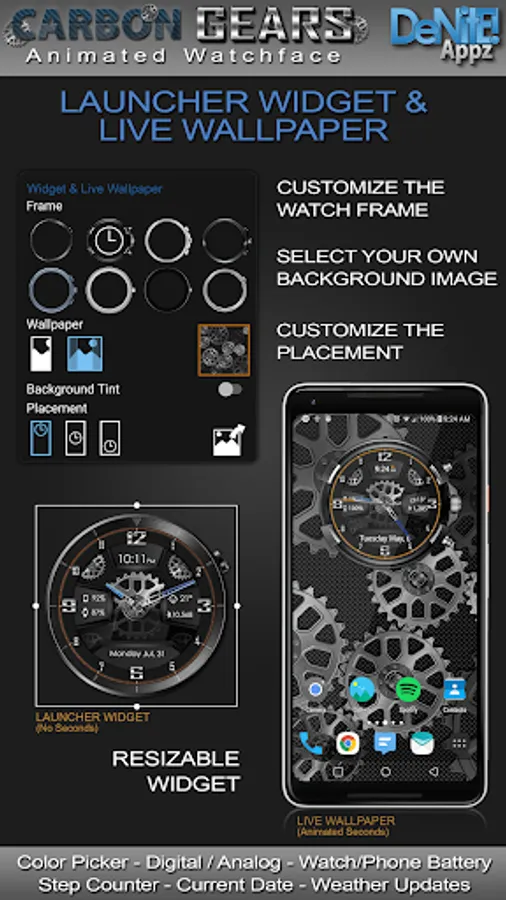 This completely customizable interactive HD Wear OS Watch Face, Clock Widget & Live Wallpaper brings a classic elegance to your wrist and Launcher. Features include custom complications, battery levels, weather conditions, step counter, color picker & date information. A settings app will also be installed on your mobile device to configure the watch face for any look you desire. Select any color and create a completely custom look for yourself! Don't have a Wear OS watch? No Problem! You can use the clock widget or Live Wallpaper on your launcher!
