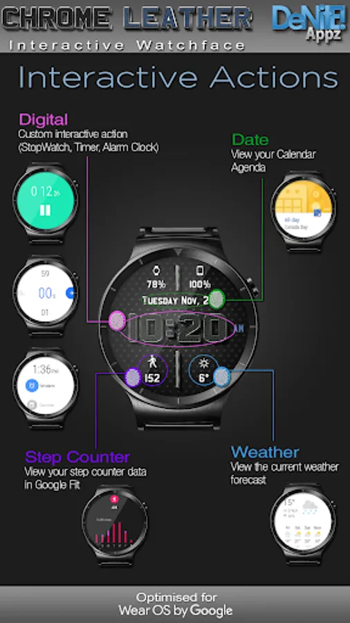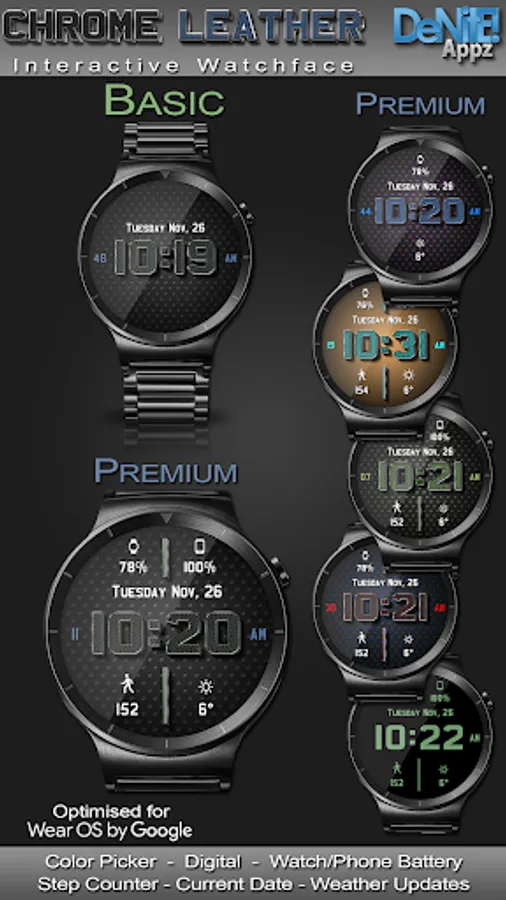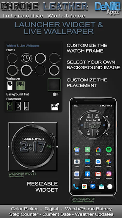 This completely customizable interactive HD Wear OS Watch Face, Clock Widget & Live Wallpaper brings a classic elegance to your wrist and Launcher. Features include custom complications, battery levels, weather conditions, step counter, color picker & date information. A settings app will also be installed on your mobile device to configure the watch face for any look you desire. Select any color and create a completely custom look for yourself! Don't have a Wear OS watch? No Problem! You can use the clock widget or Live Wallpaper on your launcher!