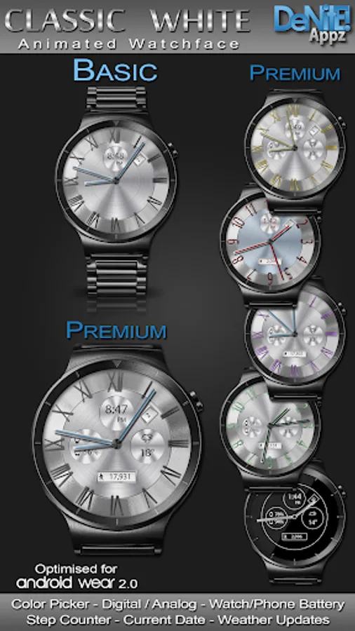 This completely customizable interactive HD Wear OS Watch Face, Clock Widget & Live Wallpaper brings a classic elegance to your wrist and Launcher. Features include custom complications, battery levels, weather conditions, step counter, color picker & date information. A settings app will also be installed on your mobile device to configure the watch face for any look you desire. Select any color and create a completely custom look for yourself! Don't have a Wear OS watch? No Problem! You can use the clock widget or Live Wallpaper on your launcher!